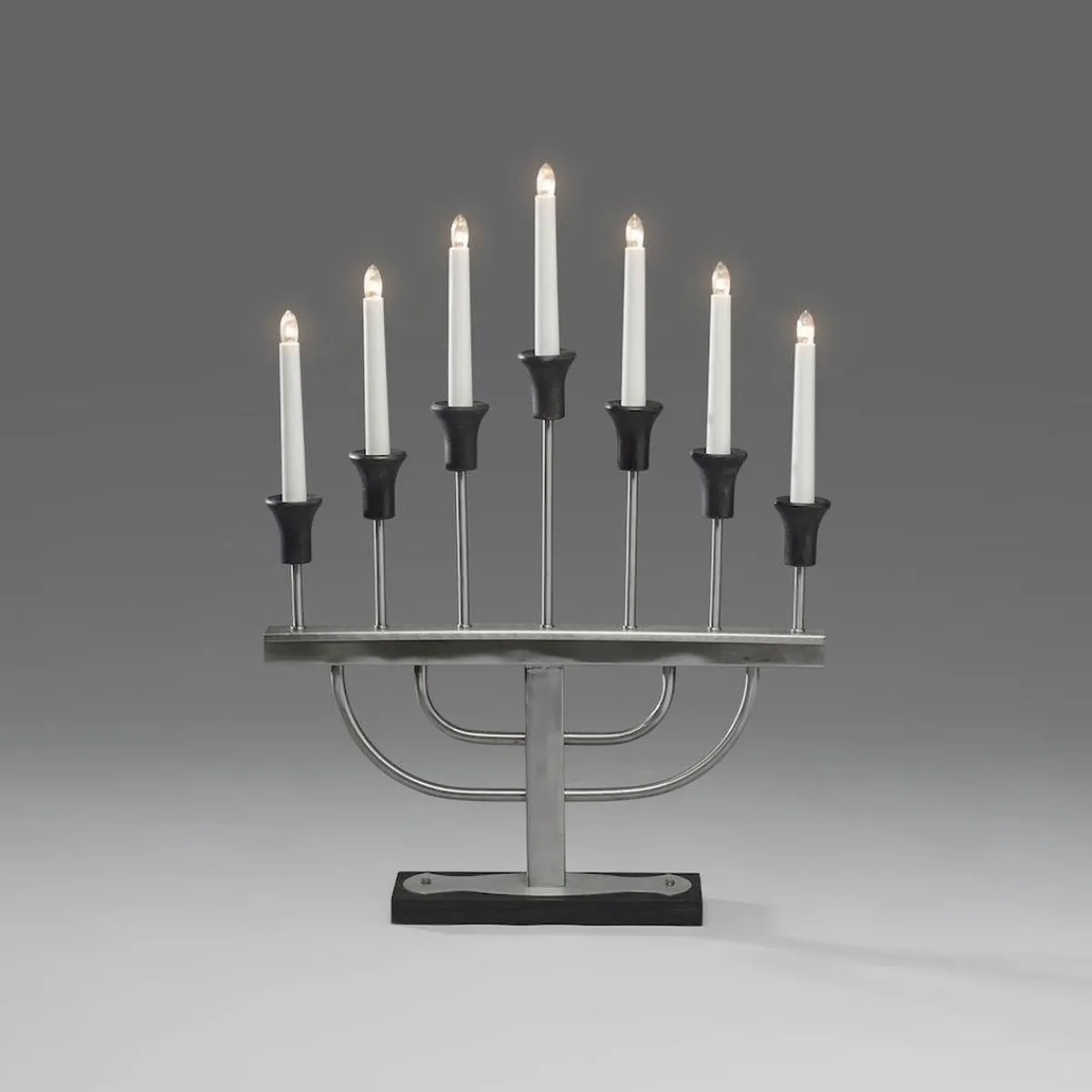 Stor adventsstake i ubehandlet metall. Rå aluminium kombinert med svart gir den et ekstra tøft uttrykk. Adventsstaken har slank fot, så selv om den er stor kan den fin plasseres i slank vinduskarm.