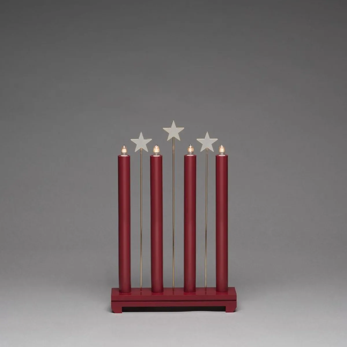 Kom i julestemning med den flotte adventsstaken i rød med 4 lys og 3 dekorstjerner.