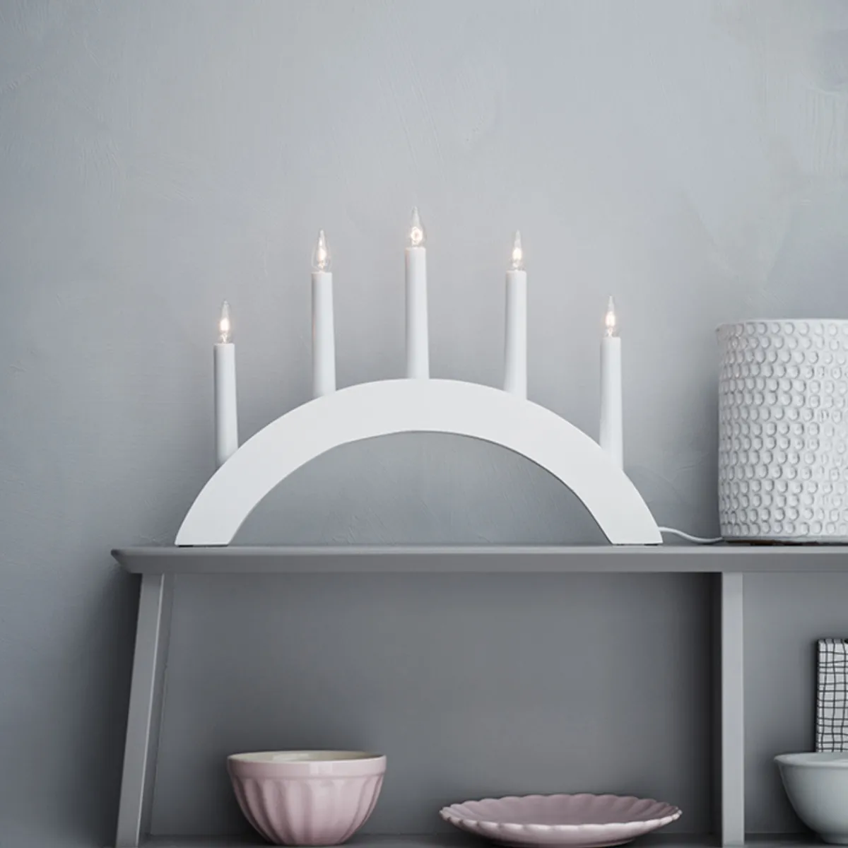 Atle bringer den klassiske adventsstake stilen til ditt hjem. Med sitt kompakte design vil den passe til og med de minste hushold. Produktet kan kjøpes med 9, 7 eller 5 lyskilder. Denne varianten kan leveres i hvitt og grått.