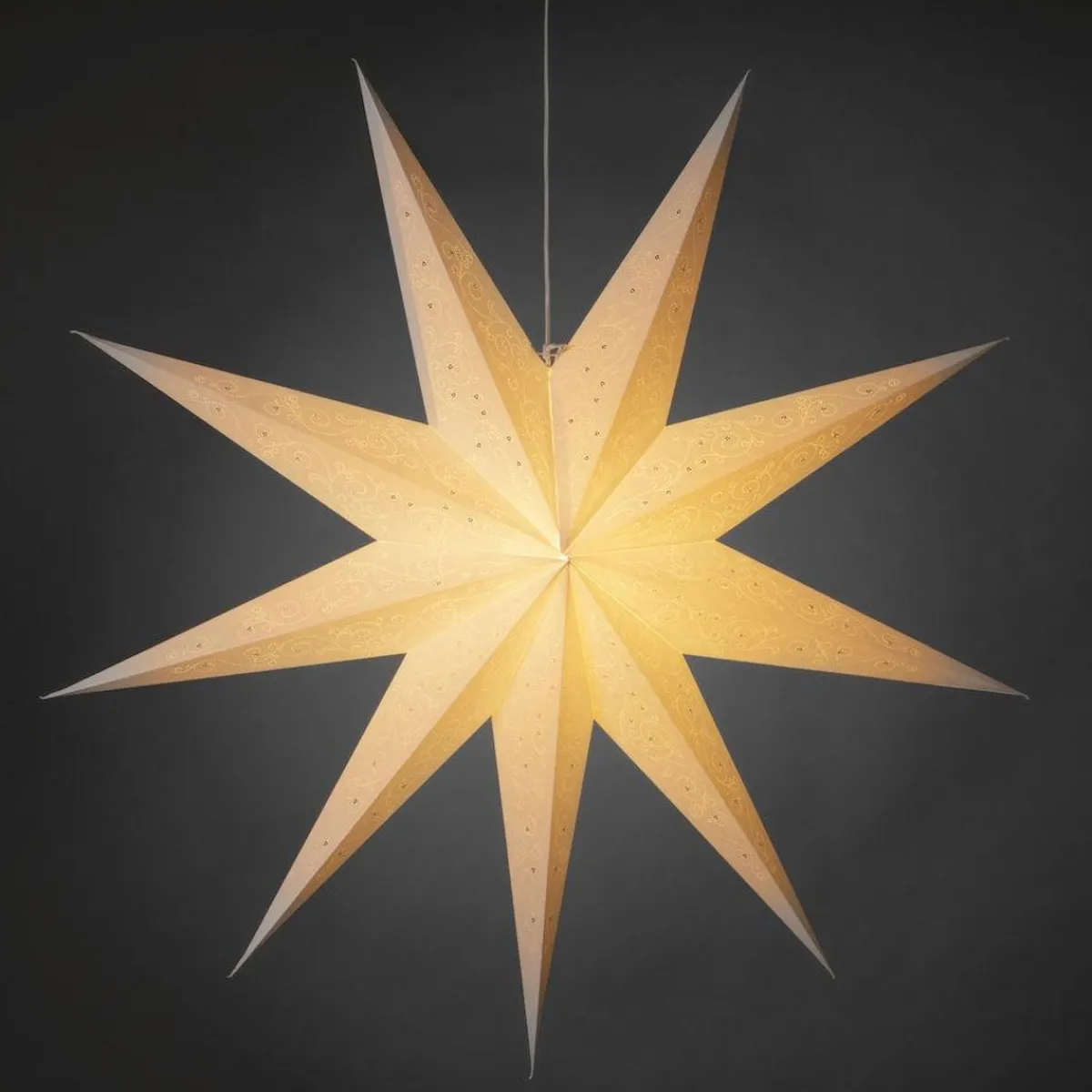Pappstjerne hvit med broderi, 9 armet. Inkludert oppheng. E14 lampeholder. Hvit kabel.