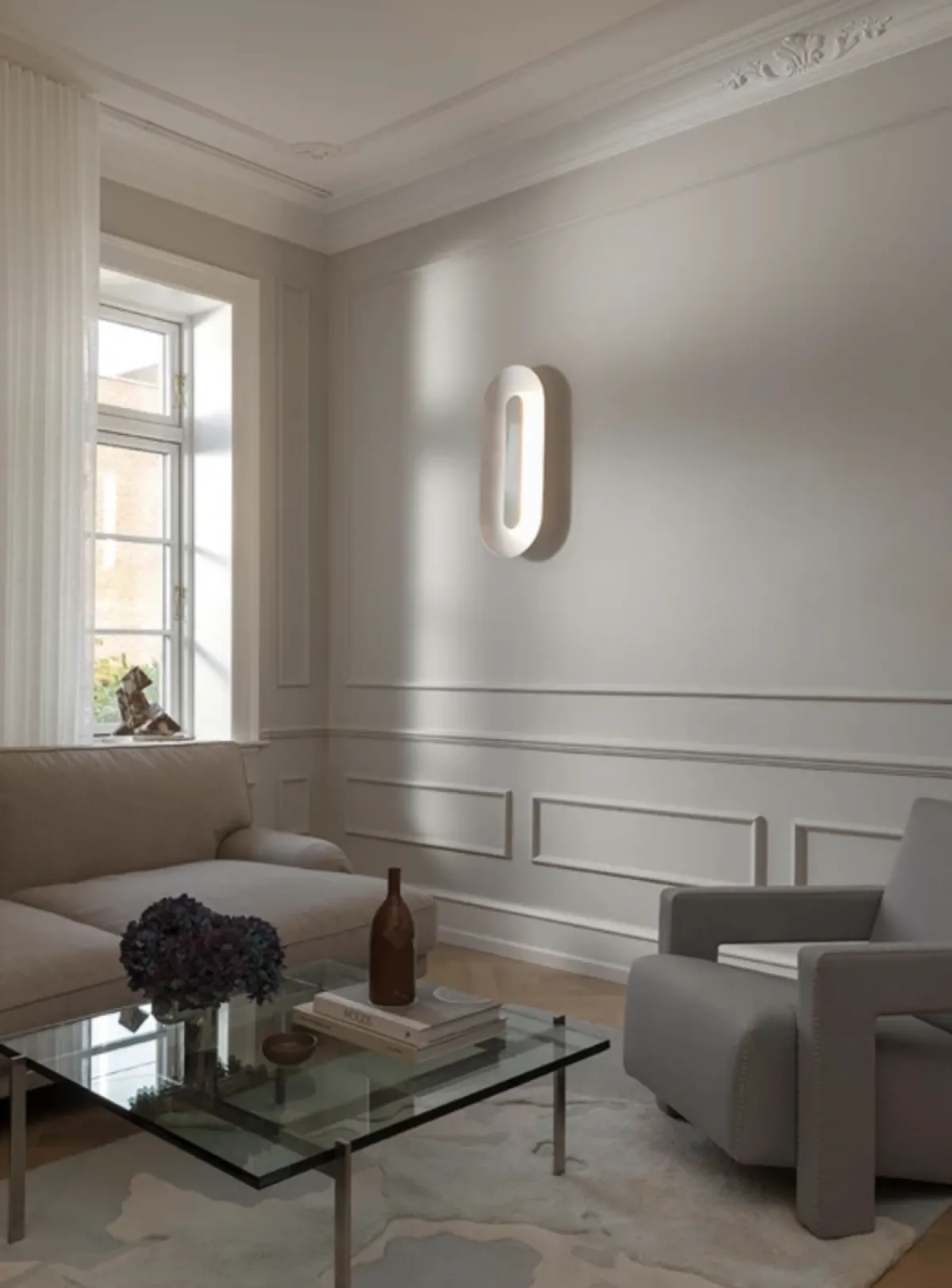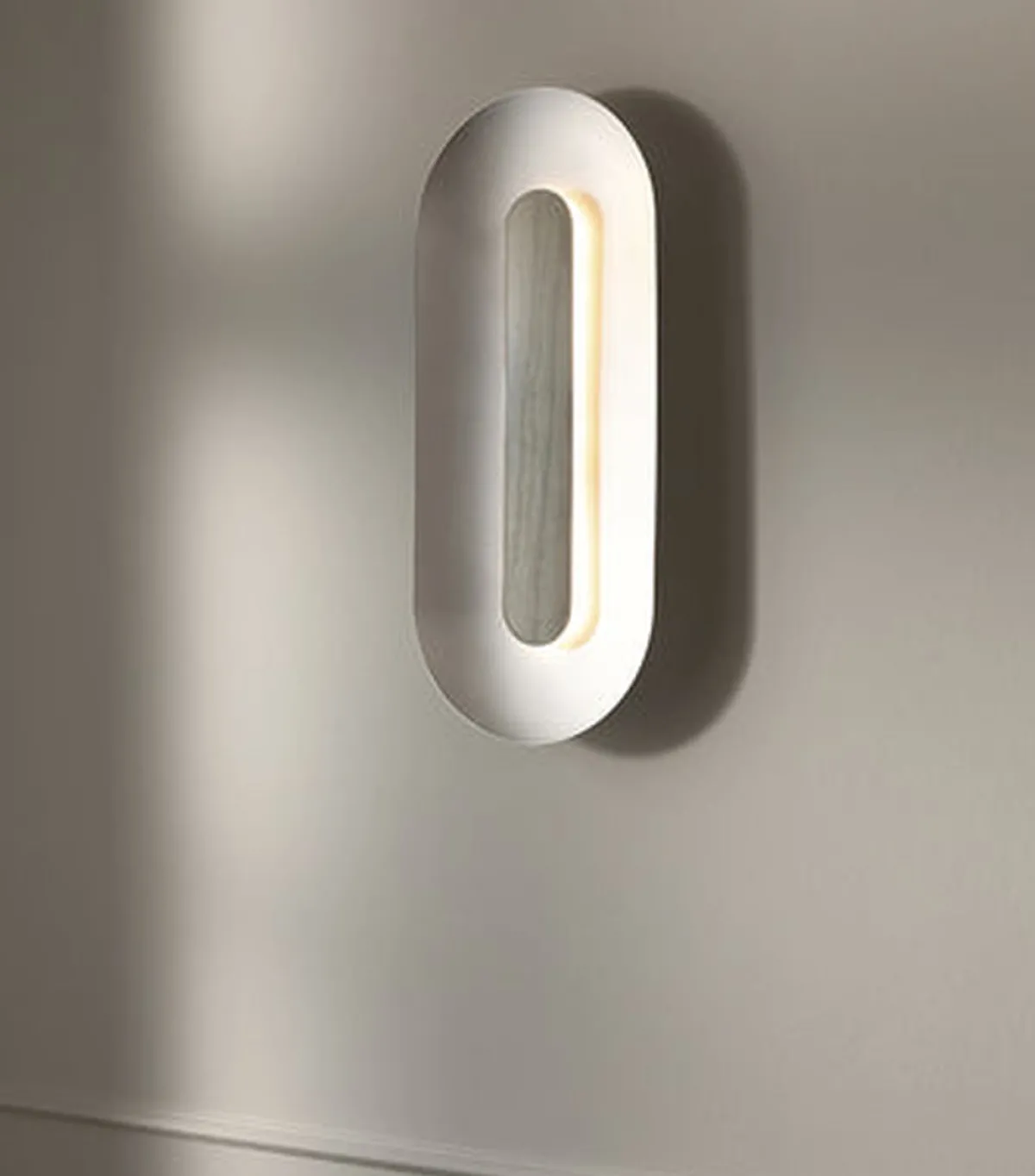 Dekorativ vegglampe med et mykt uttrykk og et behagelig, indirekte lys. Sasi Large vegglampe er konstruert med en stor rund metallramme i sateng sølv finish og en lampeskjerm i polert sølv finish. En integrert LED-modul er plassert bak den polerte skjermen og reflekterer lyset i den store metallrammen. Sasi Large vegglampe kan fungere både som et dekorativt element og som ambient belysning i stuen.