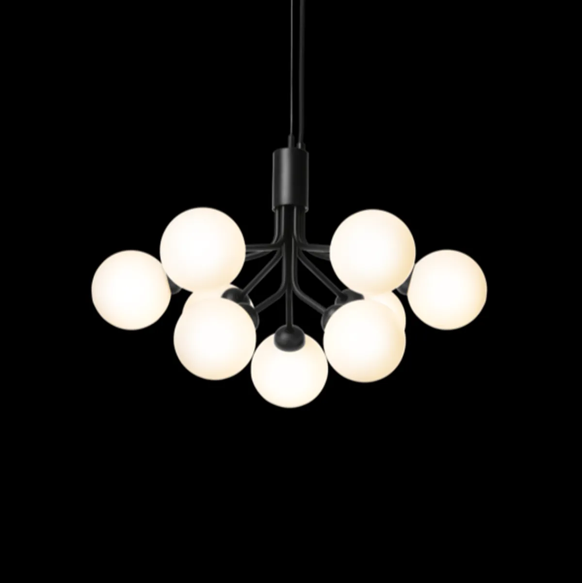Inspirert av blomster har Sofie Refer designet Apiales-kolleksjonen. Samlingen består av to lysekroner med 9 eller 18 munnblåste glassbolter og er tilgjengelig i gylden Brush Brass-finish eller den glatte Satin Black. Armene på Apiales lysekrone minner om blomsterstilker som sprer et diffust og vakkert lys. Apiales 9, med sine 60 cm i diameter, passer over spisebordet, på soverommet eller i gangen.