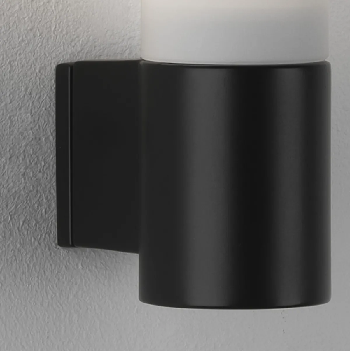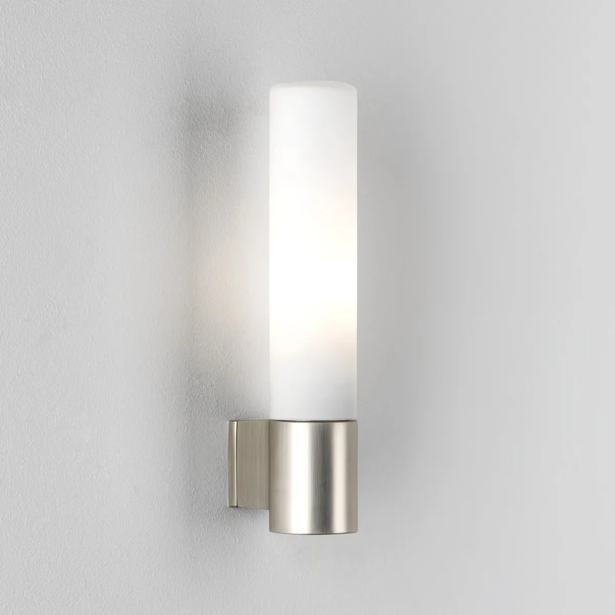 Liten elegant baderomslampe fra astro Lighting. Lampen er laget av metal og opalhvitt glass. Lampen gir goddt lys og kan dimmes med ekstern dimmer.