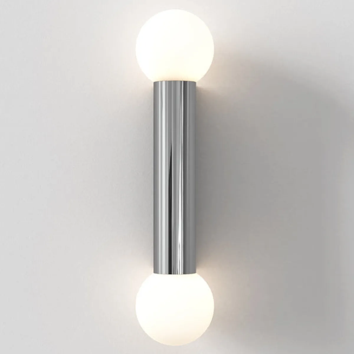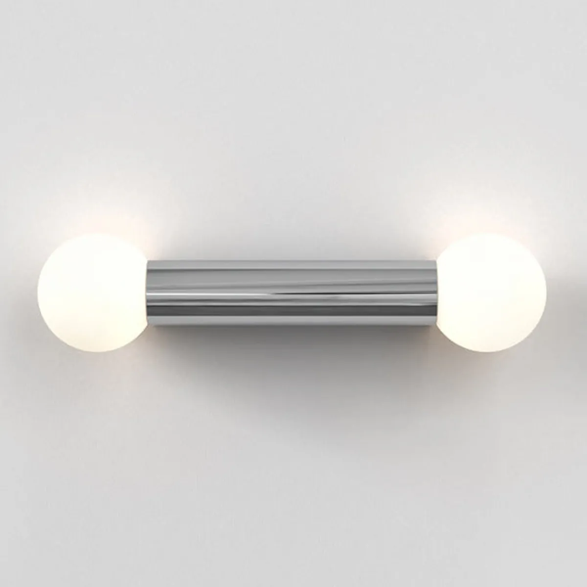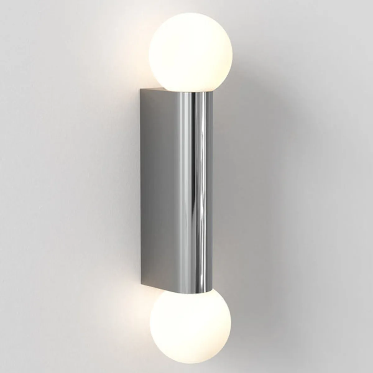 Den enkle og geometriske vegglampen til badet er designet for bruk sammen med speil og kan monteres vertikalt eller horisontalt. Kuppelen i opal glass sprer en omgivende glød.. IP44-klassifisert for sikker bruk for baderom.