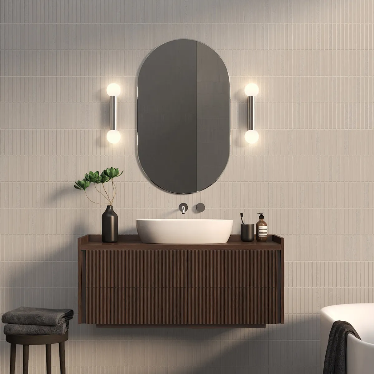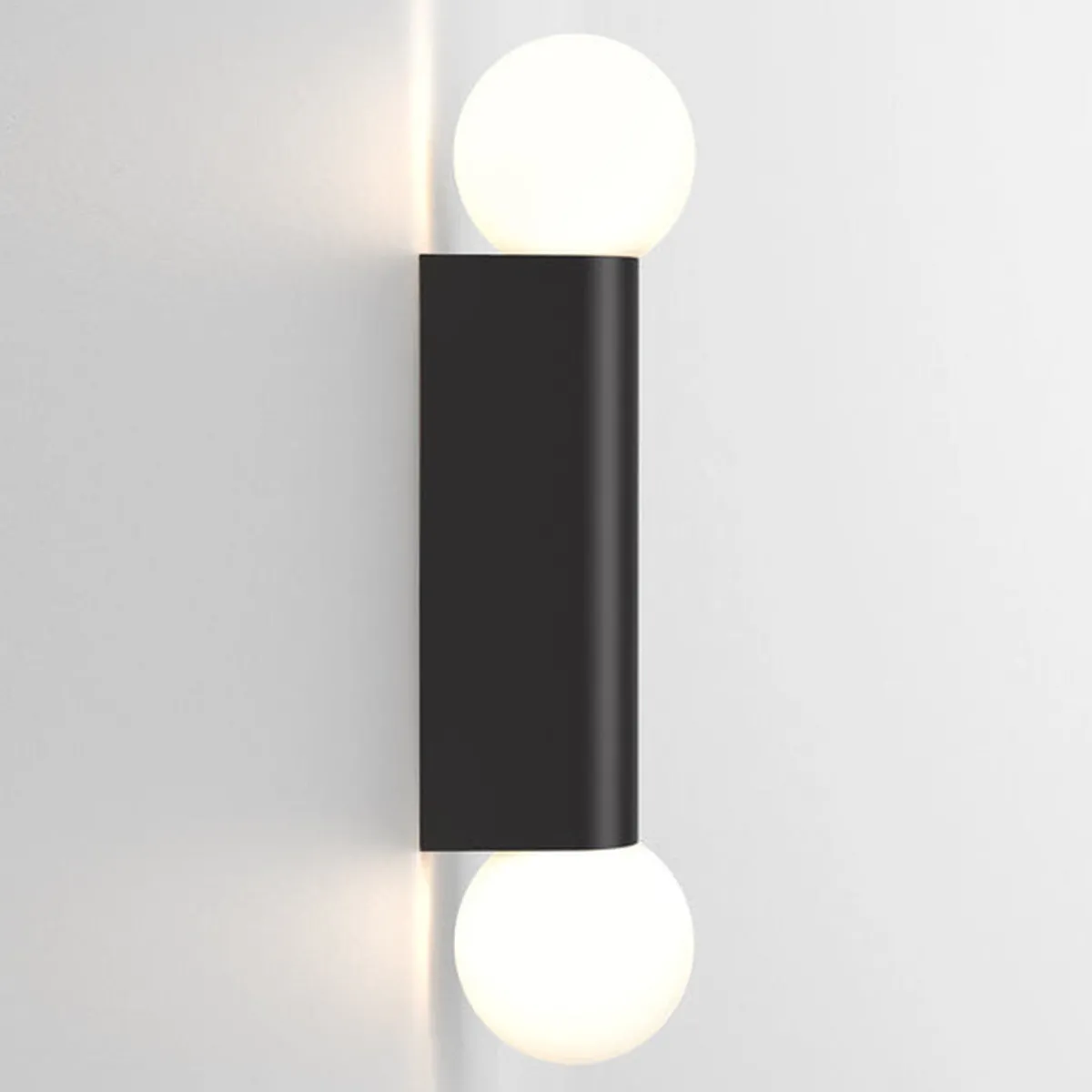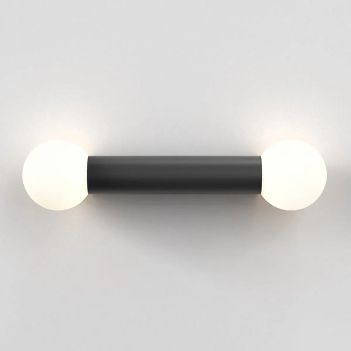 Den enkle og geometriske vegglampen til badet er designet for bruk sammen med speil og kan monteres vertikalt eller horisontalt. Kuppelen i opal glass sprer en omgivende glød.. IP44-klassifisert for sikker bruk for baderom.