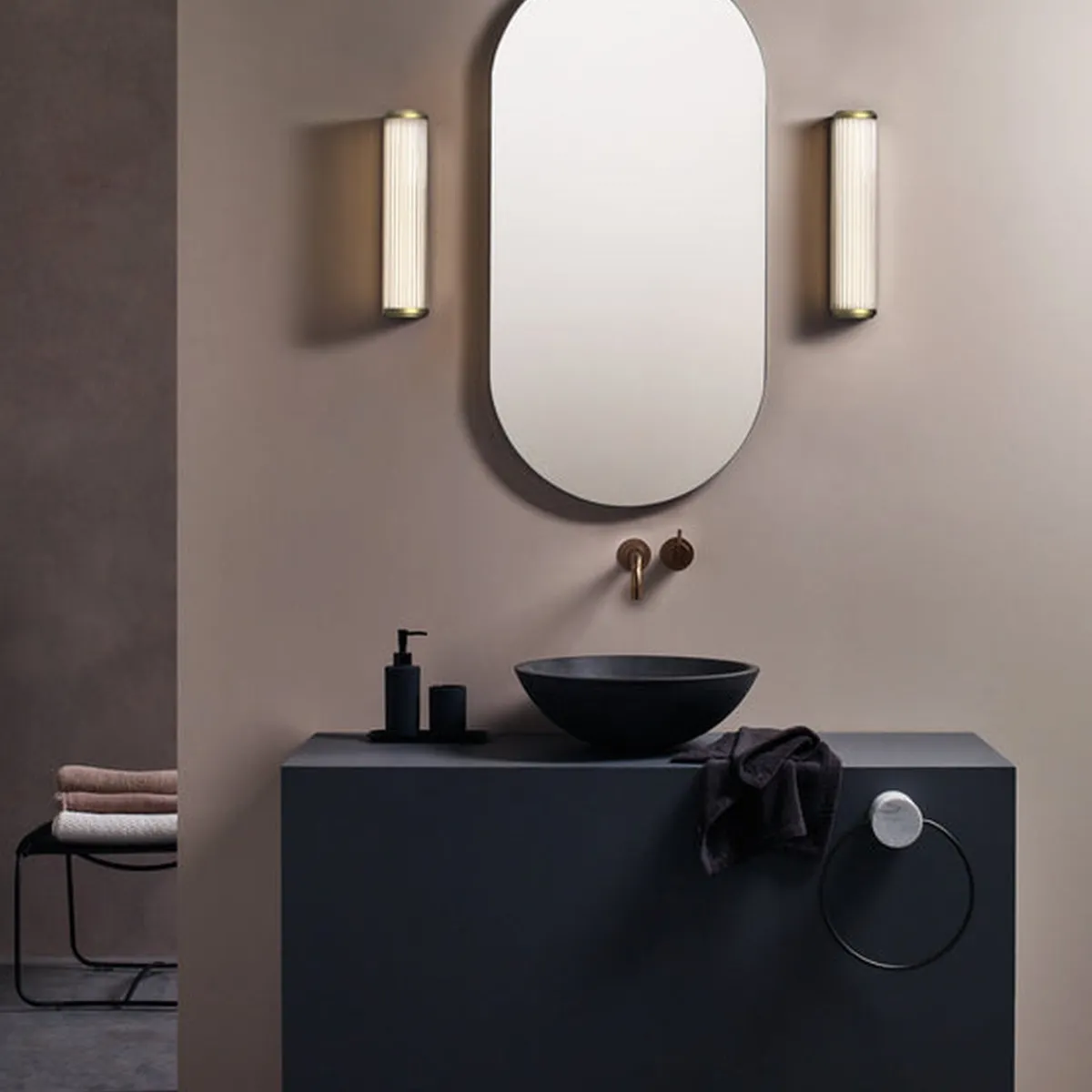 Vegglampen Versailles 370 er inspirert av klassiske design fra 1930 -tallet. Den er først og fremst beregnet for bad, men den strømlinjeformede designen utfyller ethvert rom. Laget av individuelle glass-stenger med bronse ende hetter, gir den funksjonell, blendingsfri oppgavebelysning som utstråler vintage-glamour.