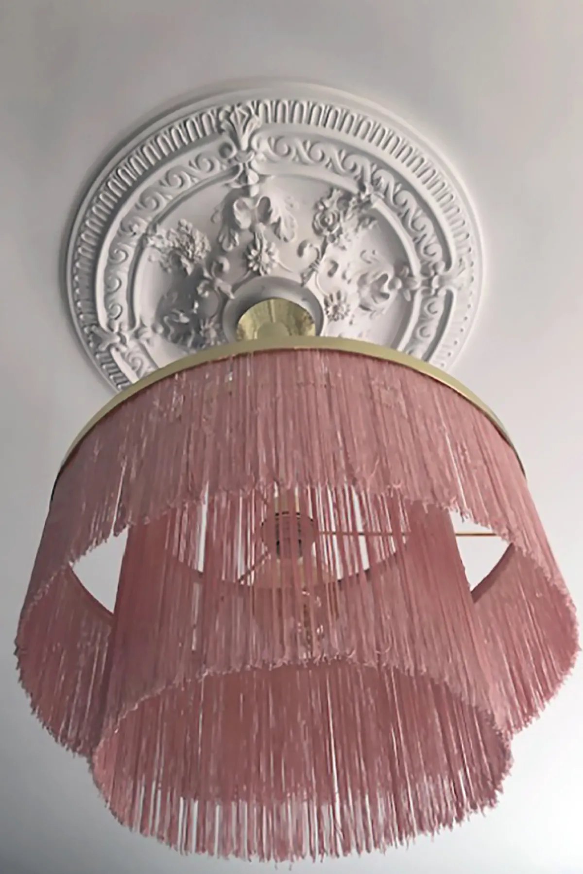 Frynser er synlige både i kleskolleksjoner og på møbler. «Frans» er en serie som utstråler eksklusivitet. Den rosa tekstilen er en fin kontrast mot messingen. Lampen avsluttes med en pen hvit tekstilledning.