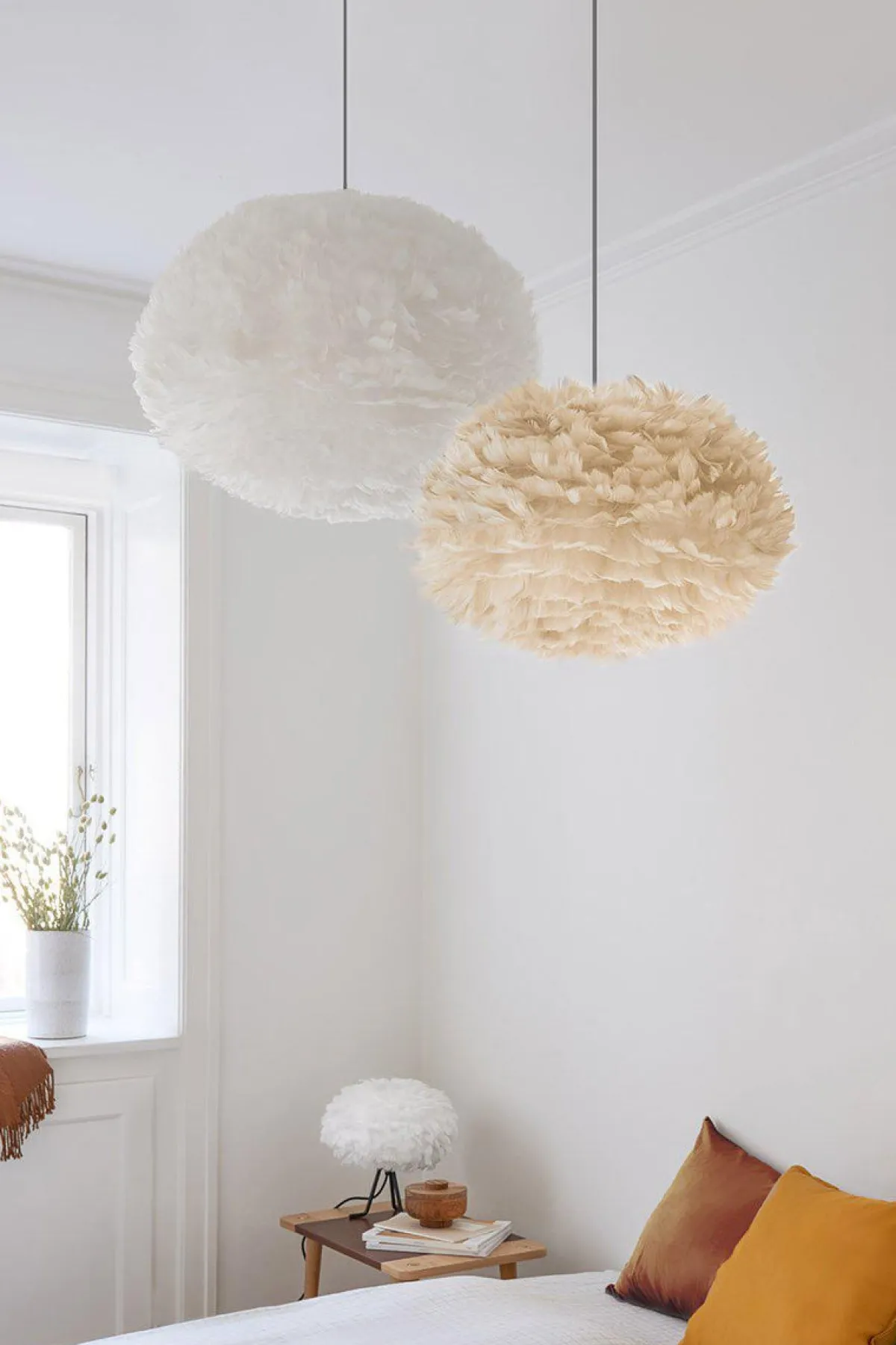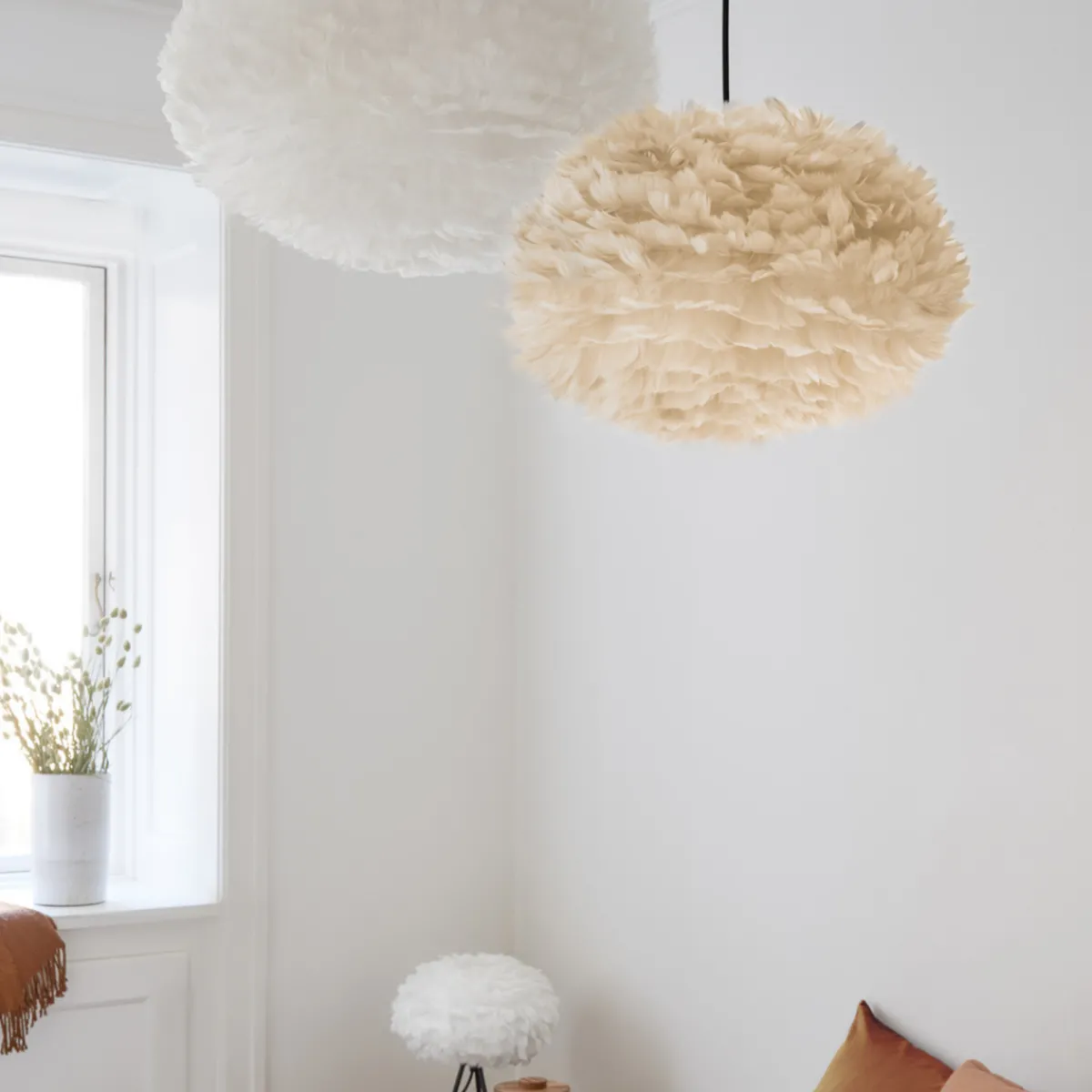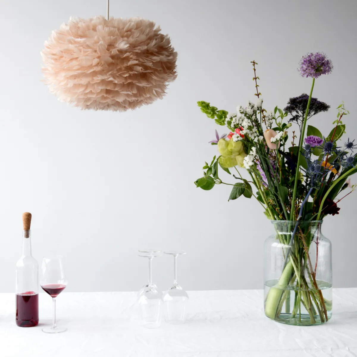 Eos-taklampe i medium måler 45 x 30 cm, noe som gjør den perfekt for kreative områder – heng de i varierende høyder i et stuehjørne eller i en rad over spisebordet. Den er laget av ekte gåsefjær.