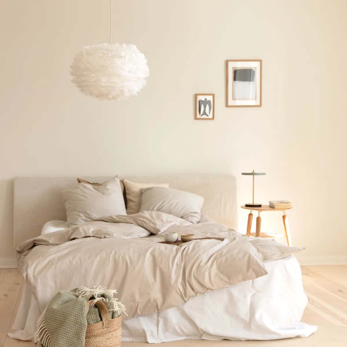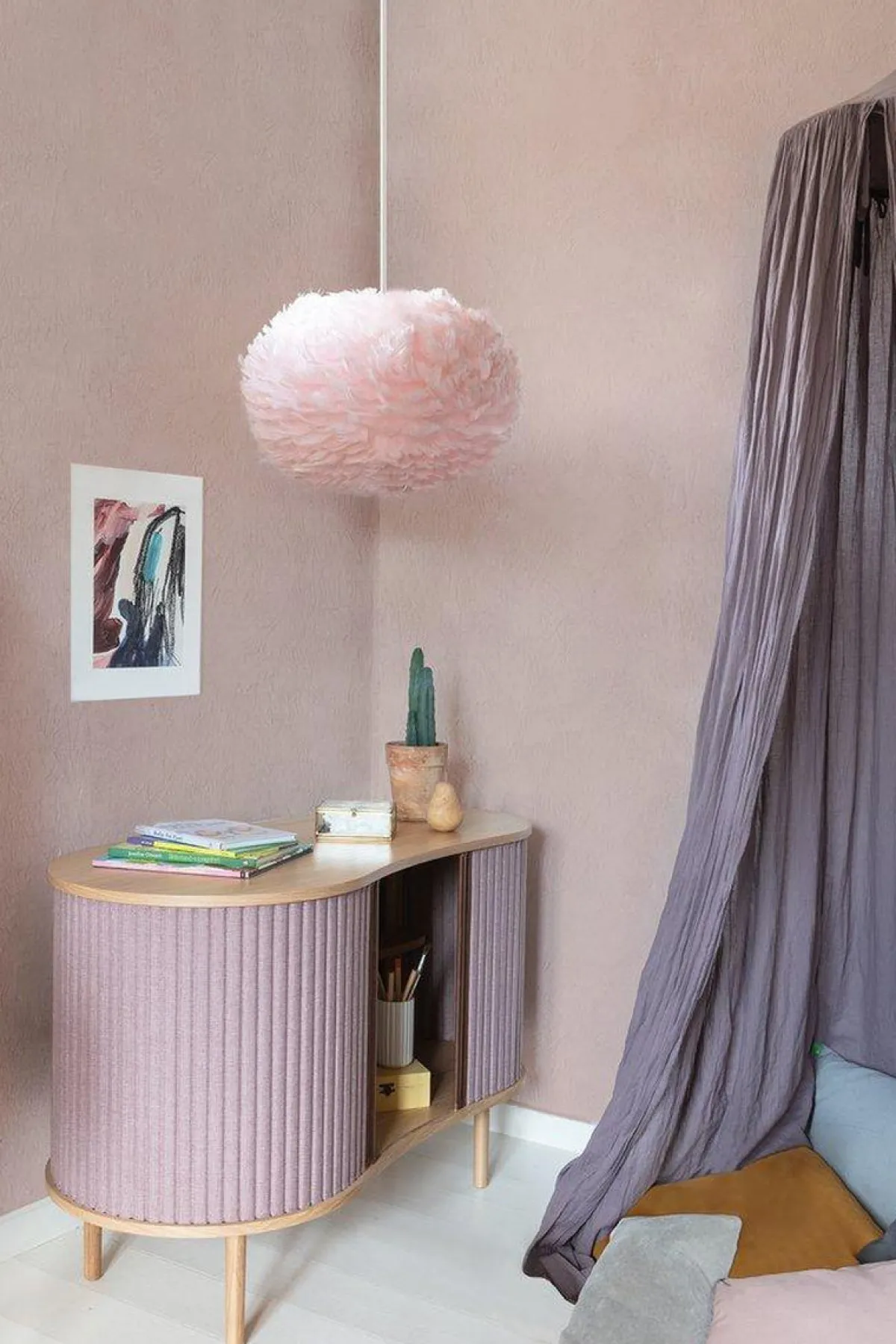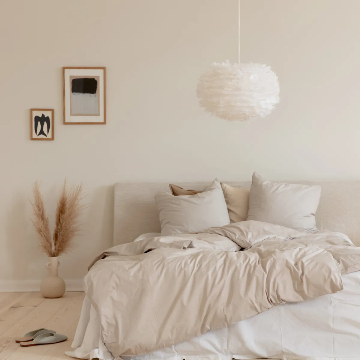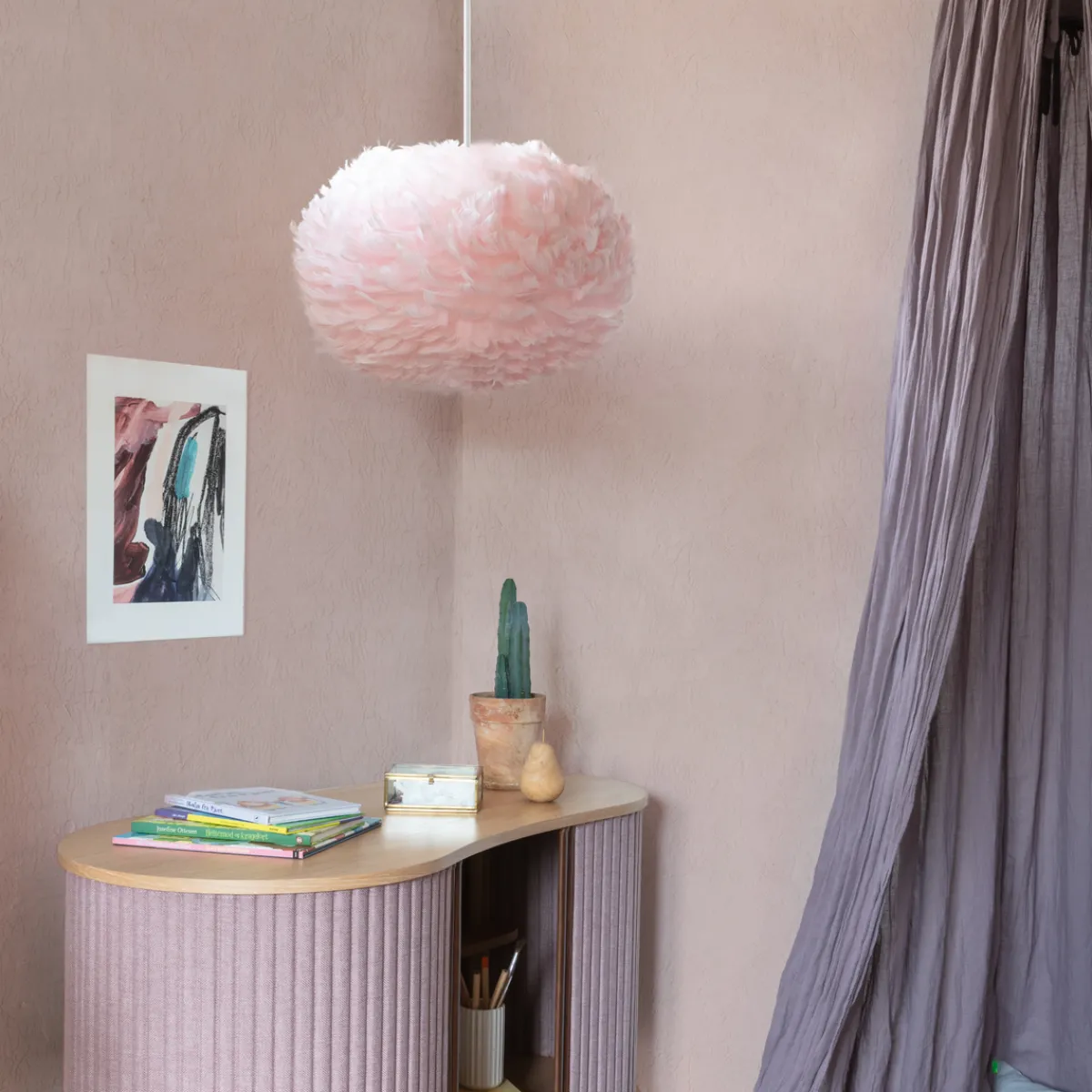 Eos-taklampe i medium måler 45 x 30 cm, noe som gjør den perfekt for kreative områder – heng de i varierende høyder i et stuehjørne eller i en rad over spisebordet. Den er laget av ekte gåsefjær.