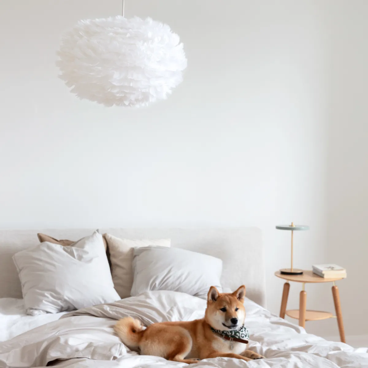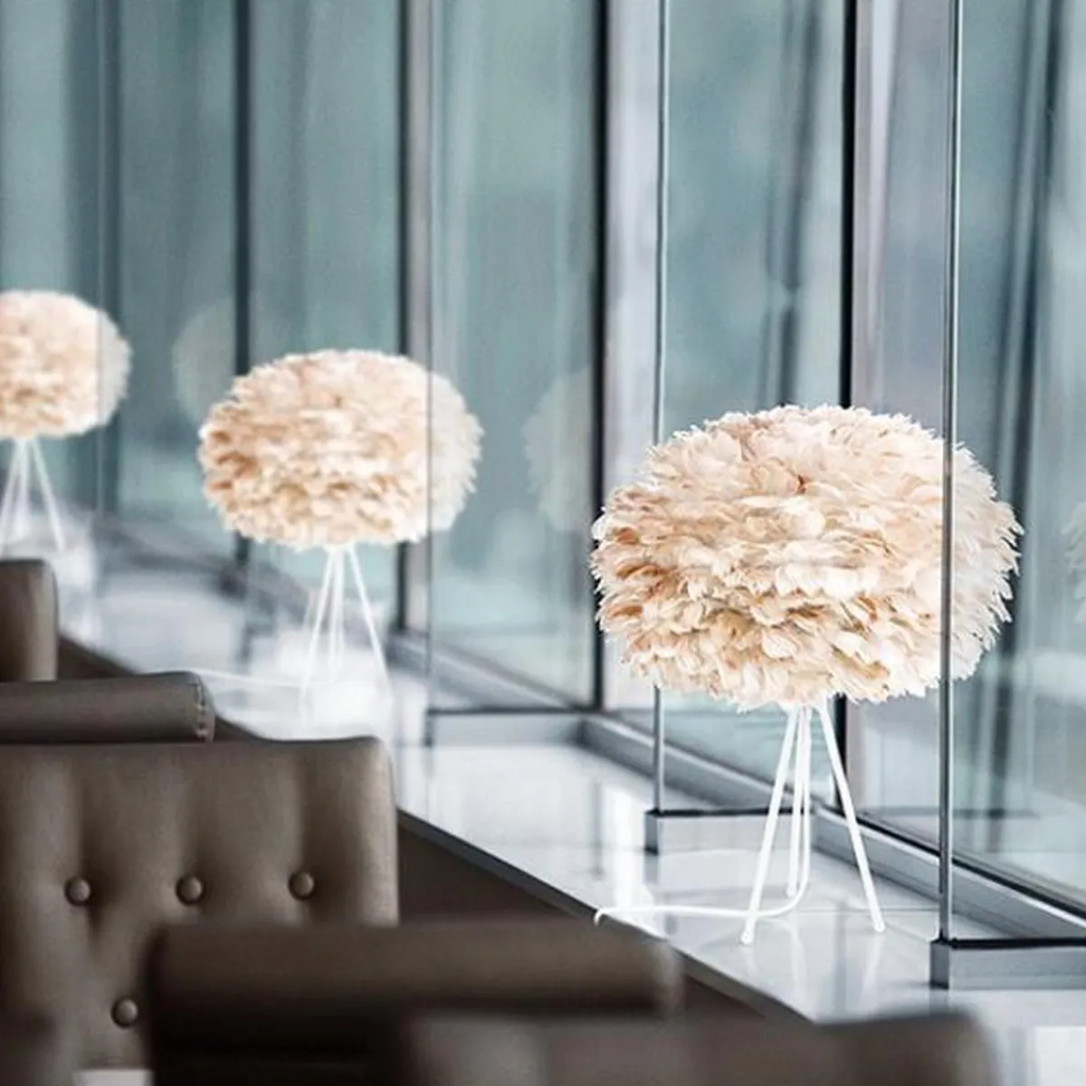 Det utstråler en myk og koselig glød. Siden lyspæren er skjermet, er Eos-fjærlampen perfekt som takpendel fra hvilken som helst høyde. Rutinemessig rengjøring av fjærlampen gjøres enkelt med en hårføner, og Eos-fjærlampen monteres ganske enkelt på nesten hvilken som helst type lampe i løpet av sekunder og kommer i vakker gaveeske.