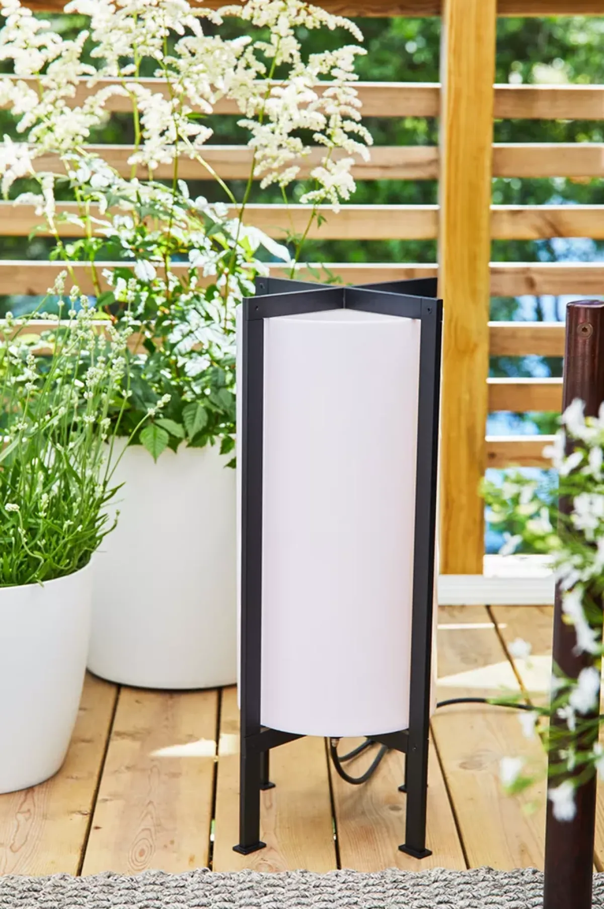 Garden 24 pullerter fra Markslöjd. 54 cm høy sylindret pullert med hvit skjerm og ramme i svart metall. Godkjent for utendørs bruk. IP44. Designet av Monika Mulder. 6W solid LED. Transformator selges separat.