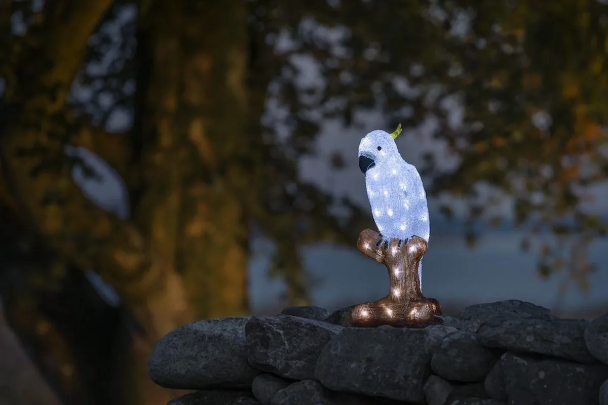 Papegøye med 48 hvite LED-lys, egnet til utendørsbruk. Transformator medfølger.