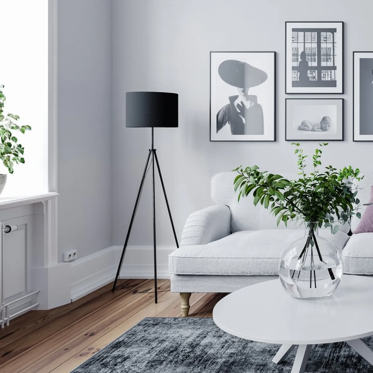 Rina er en stilren gulvlampe som står på tre bein. Skjermen i bomull fås i to farger, svart eller hvit. Lampen kan plasseres både i soverom og hverdagsrom hvor du behøver et dekorativt lyspunkt som lyser opp. Denne gulvlampen har et klassisk design og passer godt i alle hjem. Til denne lampen benyttes 1 lyskilde med E27 sokkel, ikke glem å legge lyskilden i varekurven din.