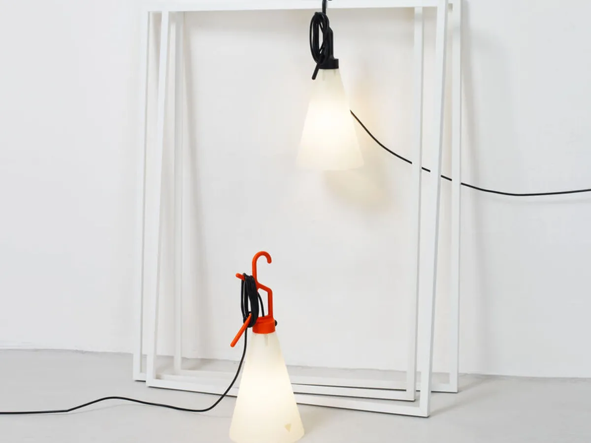 May Day er en smart, kreativ og multifunksjonell lampe som kan brukes på flere måter. Med innebygget krok kan den enkelt henges opp i taket, på en stang, settes på et bord eller la stå på gulvet. Den lange ledningen på nesten 5 meter kan surres rundt to hanker øverst på lampen – smart og gjennomtenkt. Lampen vil gi et generelt lys uten å blende, men vil også gi lys ned i bordflaten om den skulle henge over et spisebord. Lampen fungere fint som bordlampe da det er bryter på håndtaket. Finnes i flere farger. Designet av Konstantin Grcic, 2000
