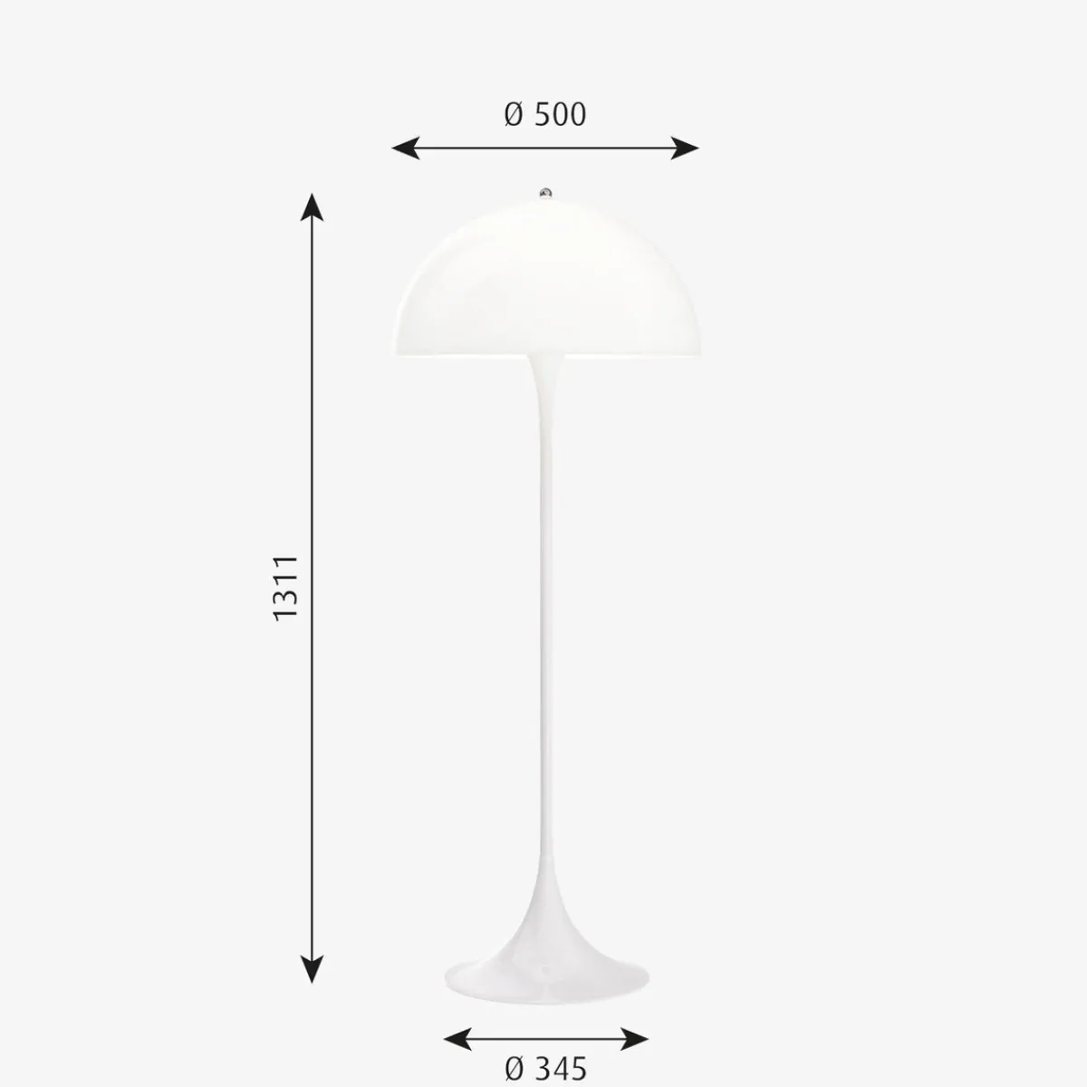 Med sitt blendefrie lys er Panthella gulvlampen et vakkert eksempel på Verner Pantons strålende sans for å skape stemningsfull belysning. Lampen gir alltid et høyt komfortnivå med mykt, diffust lys. Skjermen i opal/akryl etterlater en diffus, behagelig lysatmosfære på grunn av den gjennomskinnelige skjermen, den nedadgående refleksjonen fra den indre skjermen og refleksjonen fra trompetstammen.