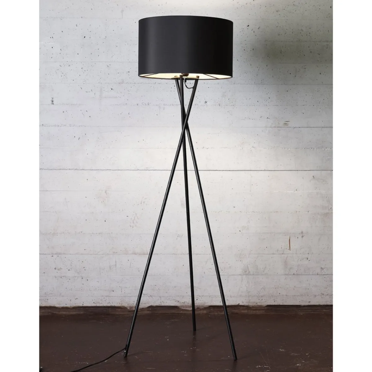 Stilren gulvlampe med skjerm i tekstil. Bryter er montert på selve ledningen.