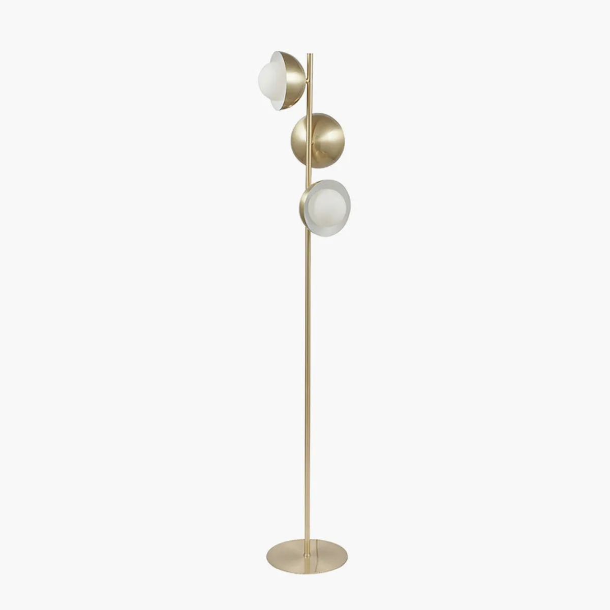 Gulvlampe i børstet messing med kupler i matt opalt glass. Bordlampe finnes i samme serien.