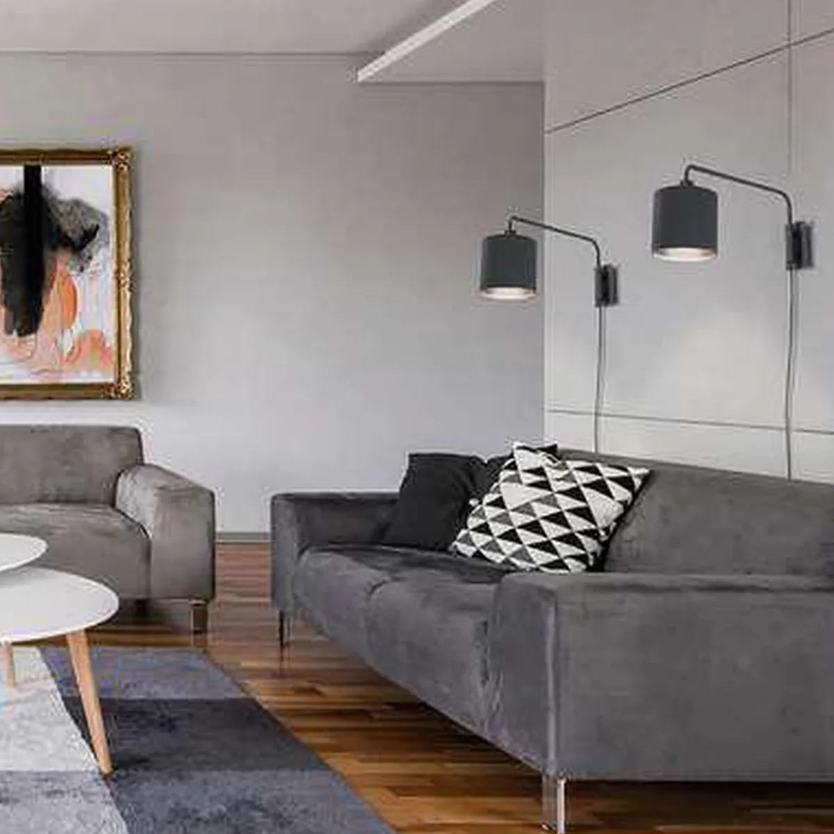 Nydelig vegglampe i svart stål, som kan reguleres fra side til side. Lampen har ledning og bryteren er montert på selve ledningen.