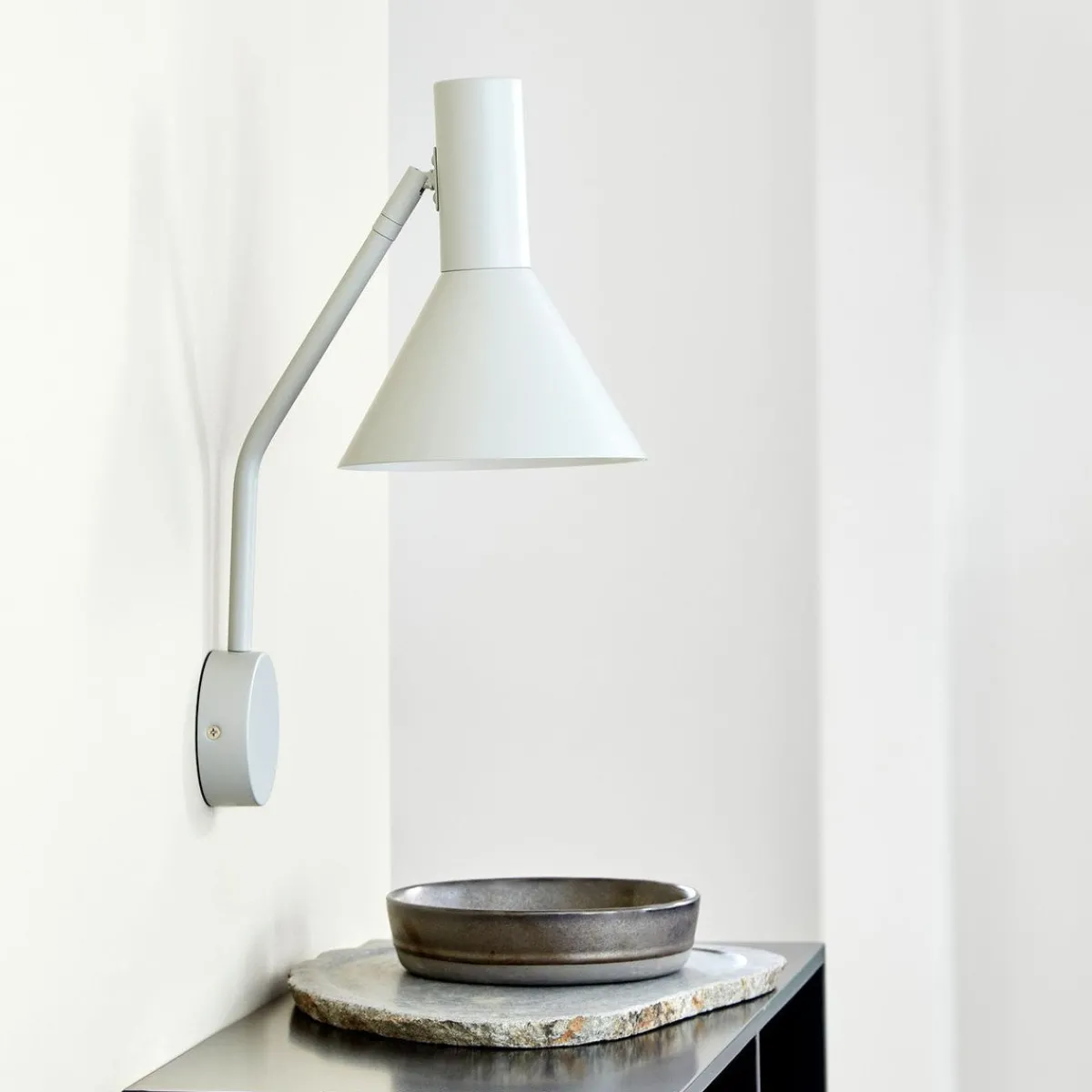 Lyss vegglampe er en enkel og ren utførelse av en vegglampe. Den koniske skjermen, med sin reflekterende hvite underside, retter lyset akkurat dit du trenger det. Et vippbart ledd er plassert mellom skjermen og armen, og lampen monteres på veggen ved hjelp av en enkel rund metallsokkel.