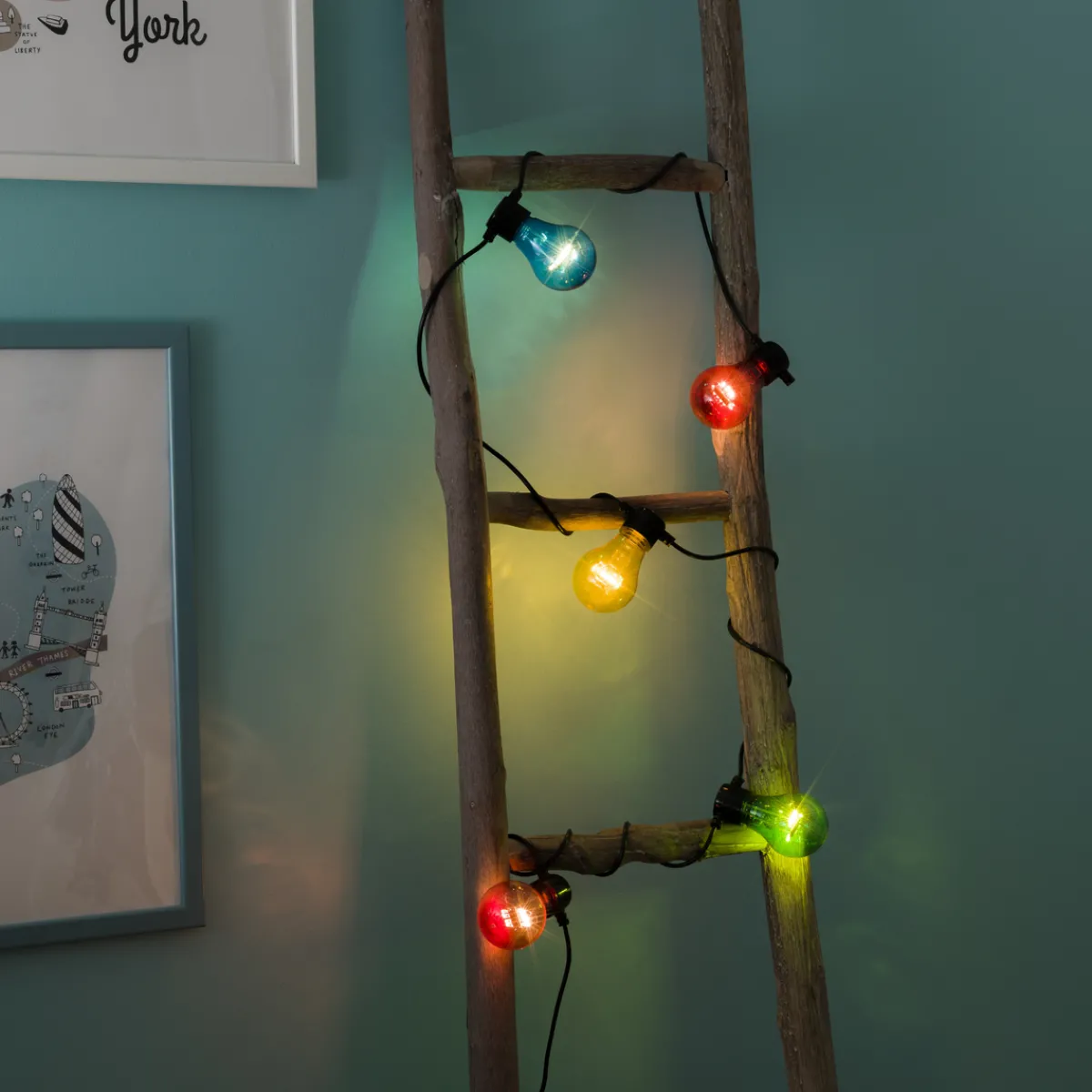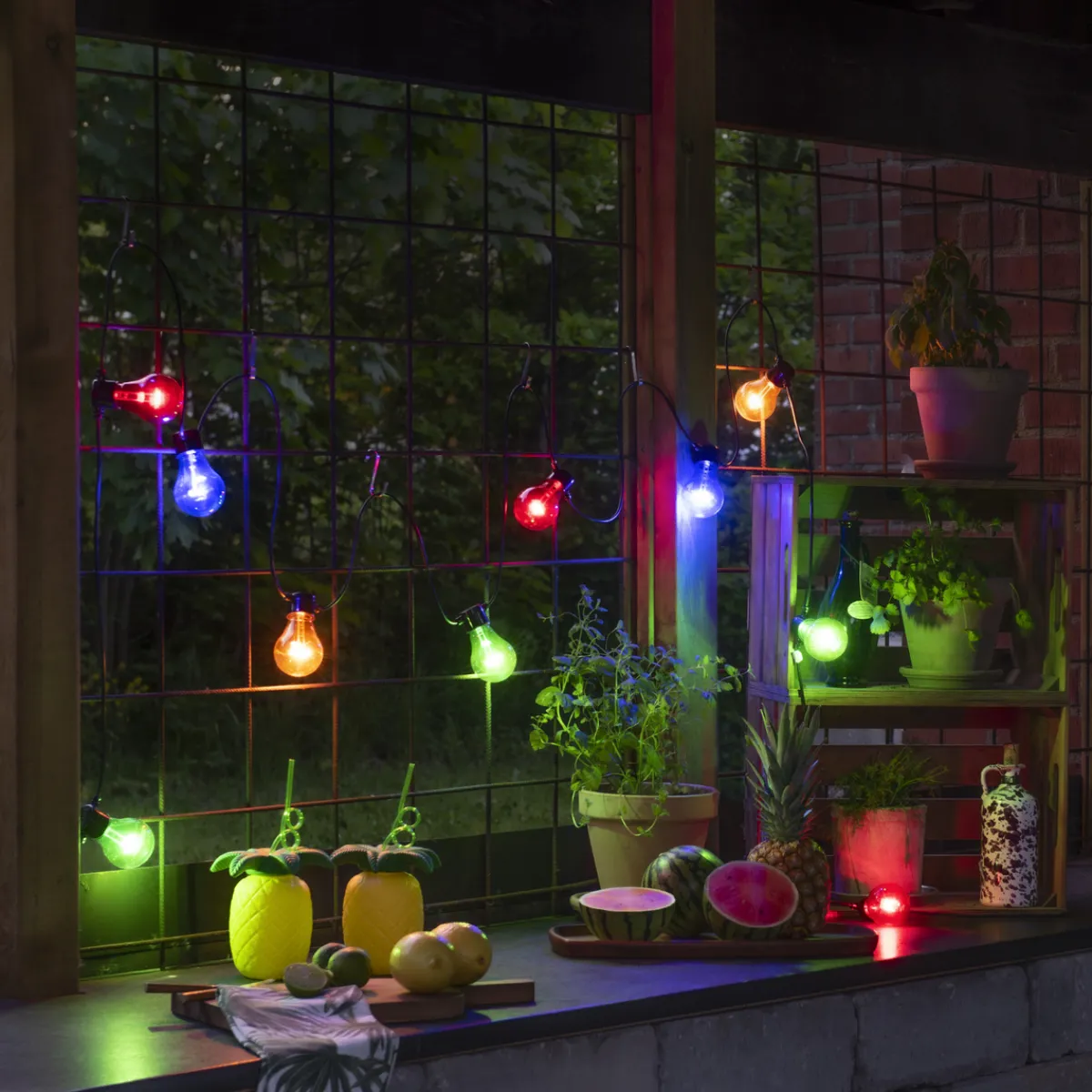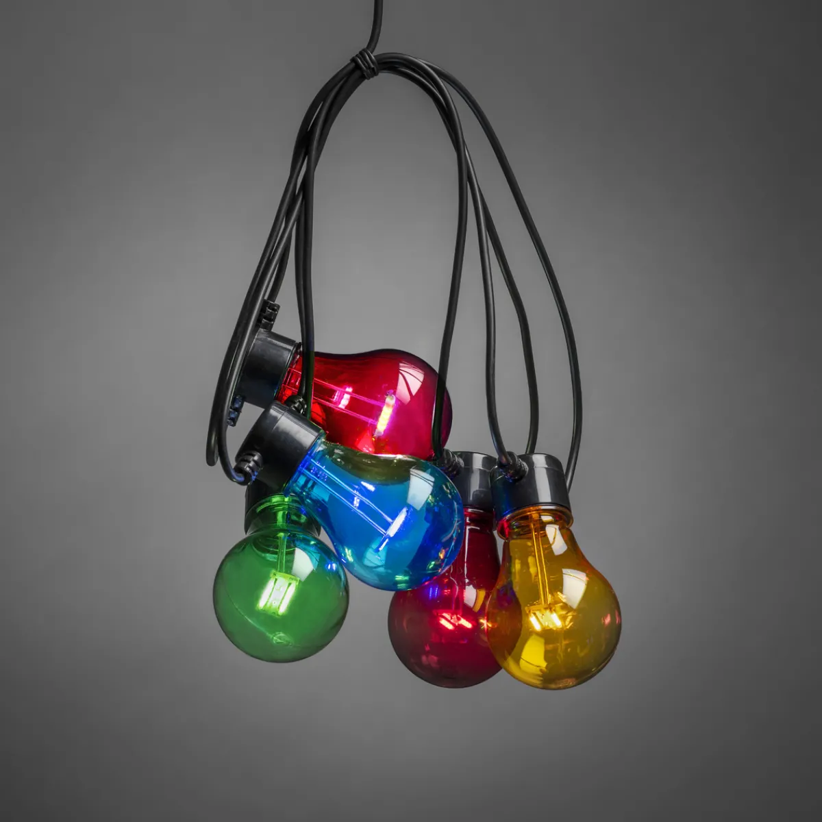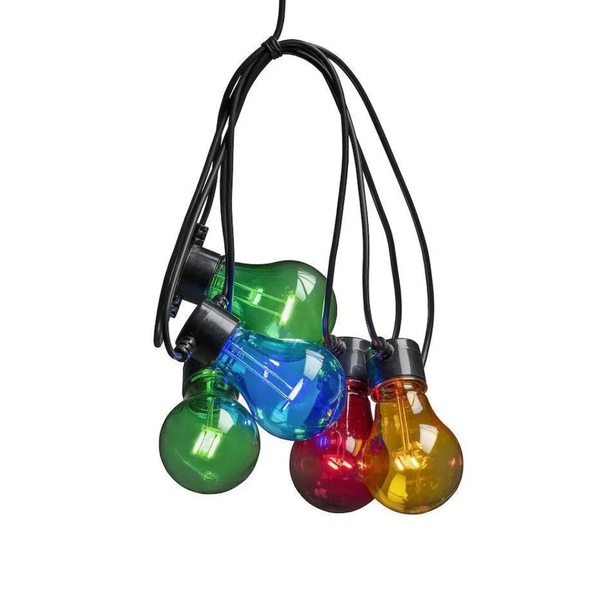 Lysslynge med 5 flerfargede LED-lamper. Faststøpte lyspærer og kuppel i plast som gjør dem uknuselig. De flerfargede lysene er med på å skape en koselig stemning.