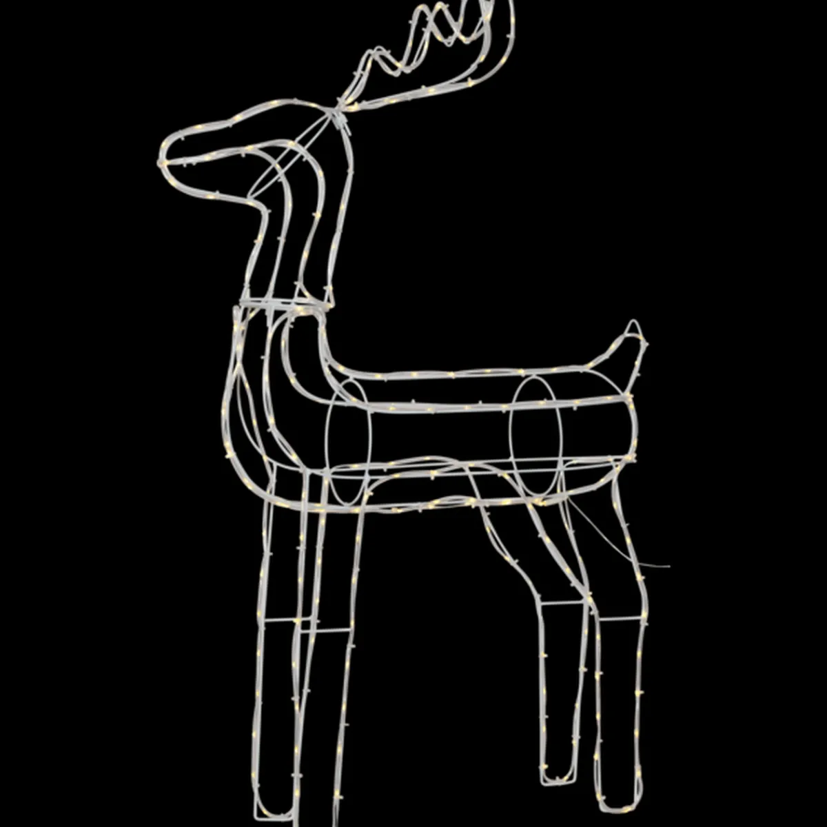 Stemningsfull dekorasjon for hagen din eller terrassen. Reinsdyr med duggdropsløyfe beskyttet i et smalt plastrør, 105 cm høyt med 220 LED -lyspunkter.