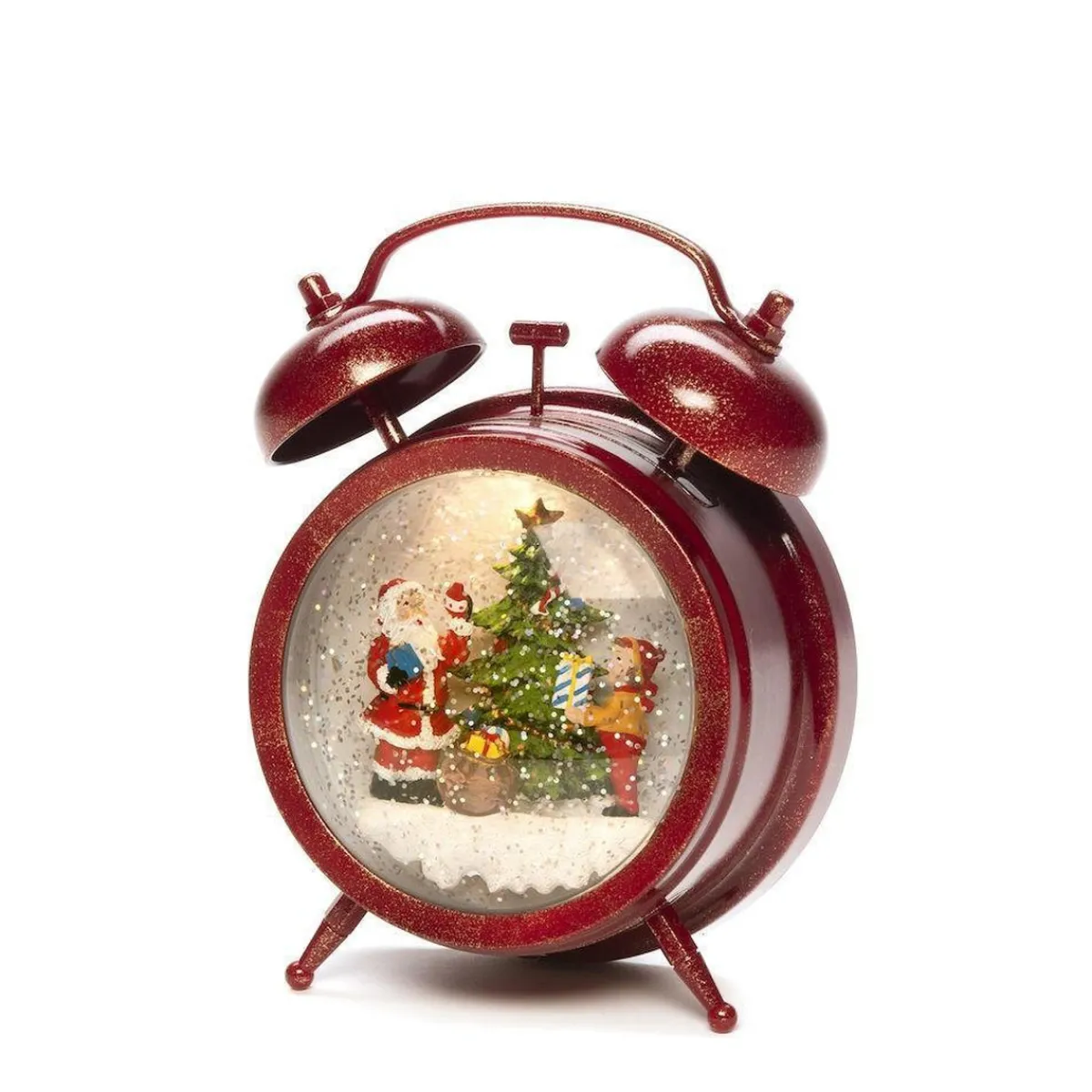 Vannfyllt vekkerklokke med nisse, barn og juletre. Varmhvit LED, musikk og timer, 5 timer.