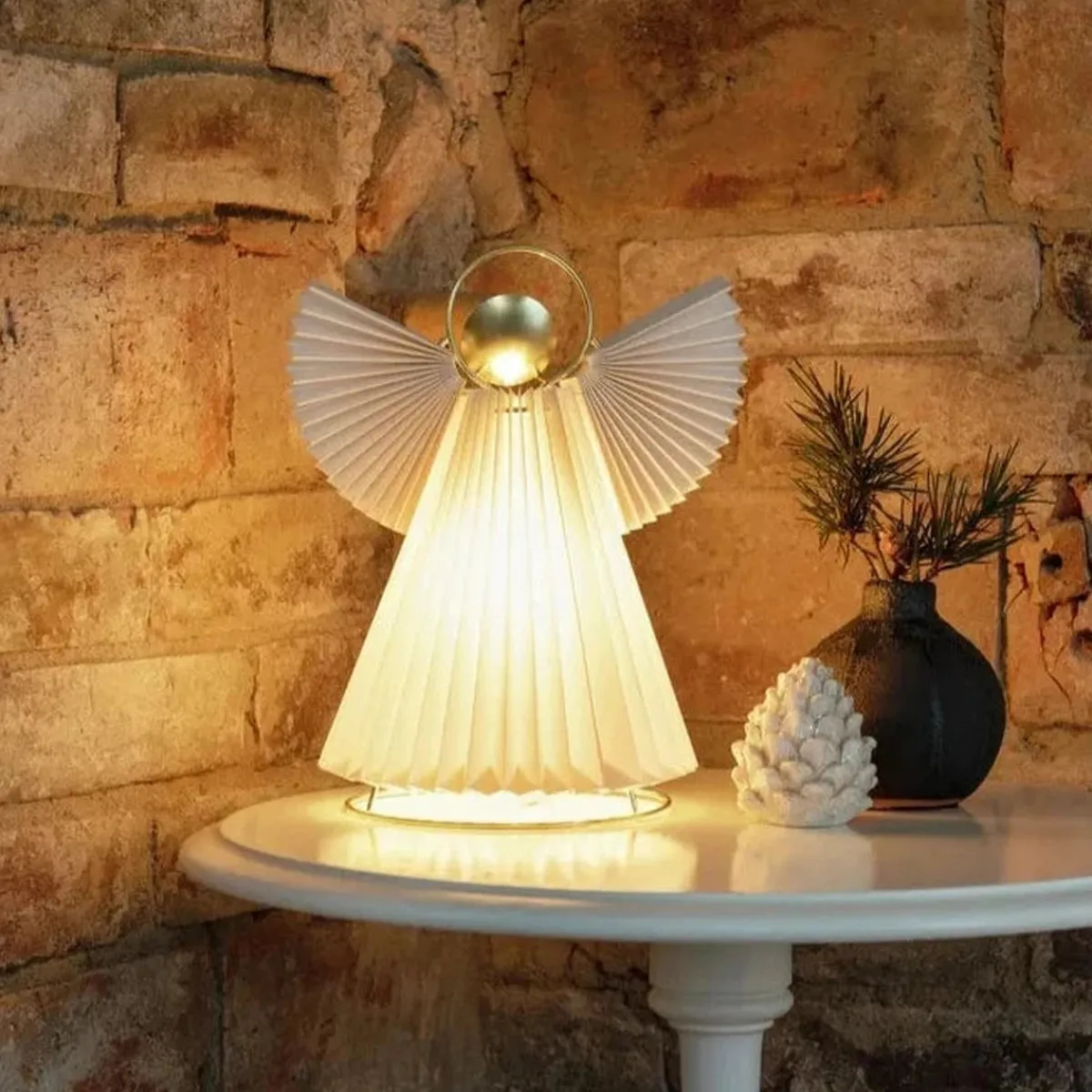 Engel i papp og messing. 26 cm høy. E14 lampeholder og ledning med bryter.
