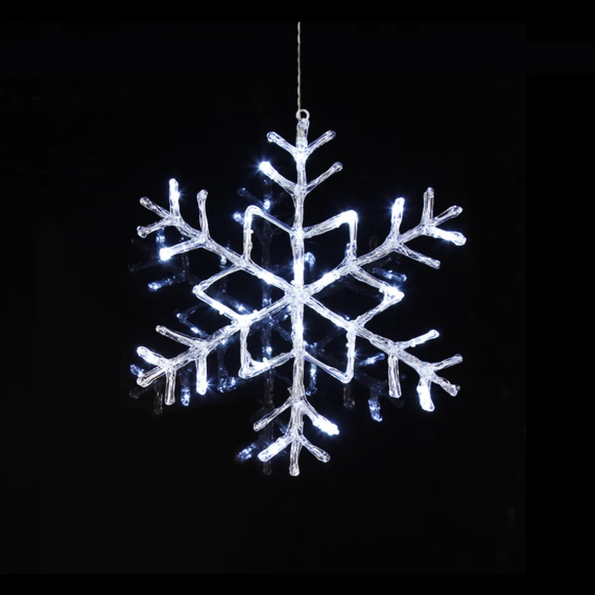 Hengende snøfnugg for utendørs bruk. Vakker dekor til å henge i hagen. Snøfnugget gir en fin glød og skaper en fantastisk atmosfære i mørket.