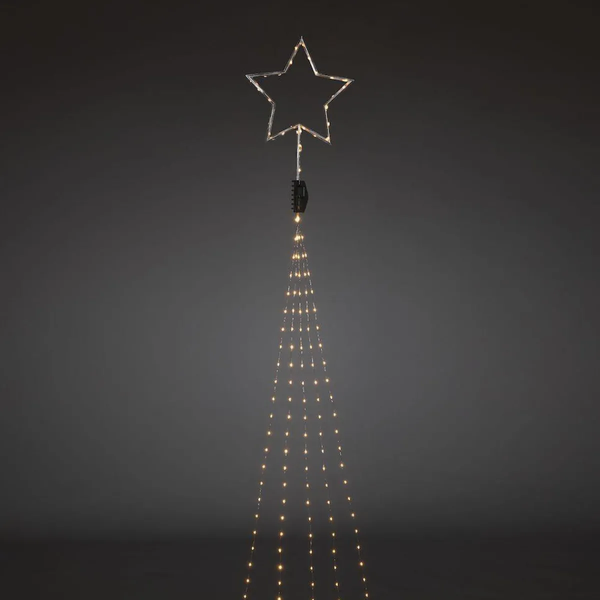 Tpppstjernen festes i toppen av treet med en klype, og ut fra denne går det 5 slinger med 274 amber LED. Slyngen er i metalltråd med innstøpe LED dioder. Fest stjernen i toppen og draper enkelt slyngene ned fra denne.
