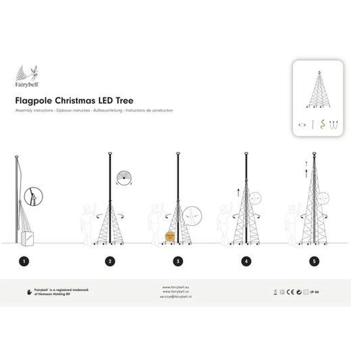 Da er julebelysningen fra Fairybell® virkelig noe for deg! Denne 800CM høye julebelysningen, som er formet som et juletre, har 1500 LED-pærer og tåler så godt som alle slags værforhold. Fairybell® er lett å sette opp, og det tar ikke mer enn 30 minutter, i og med at du heiser opp juletreet i flaggstangen like enkelt som et flagg. Lyslenkene kobles til en spesiell værbestandig 31-volts transformator, som enkelt, eventuelt med en tidsbryter mellom, kan kobles til strømnettet. Etter julefeiringen kan du enkelt oppbevare juletreet i originalesken, slik at du kan ha glede av det i år etter år.