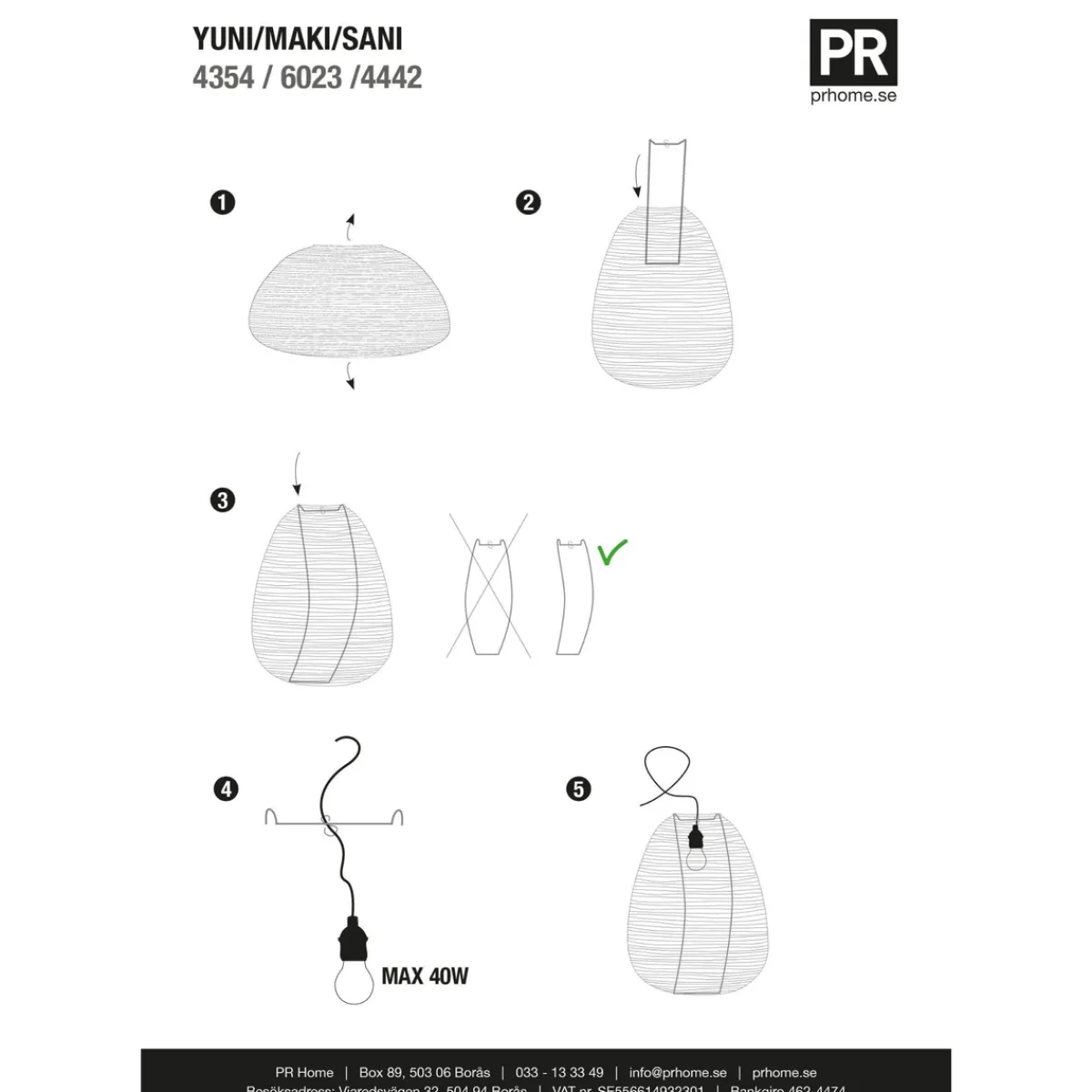 Skjermen leveres flatpakket, med en medfølgende metallekspander som brukes inni lampeskjermen for å holde lampens form. Ettersom lampeskjermen er laget av papir, må den håndteres forsiktig når metallrammen settes i.