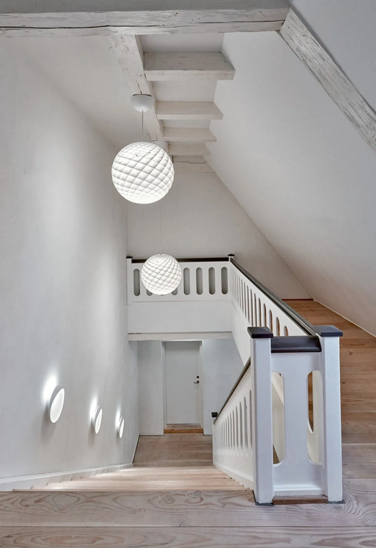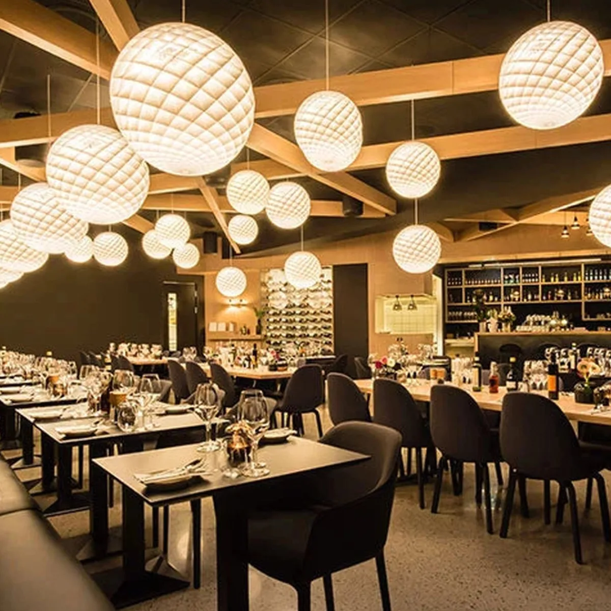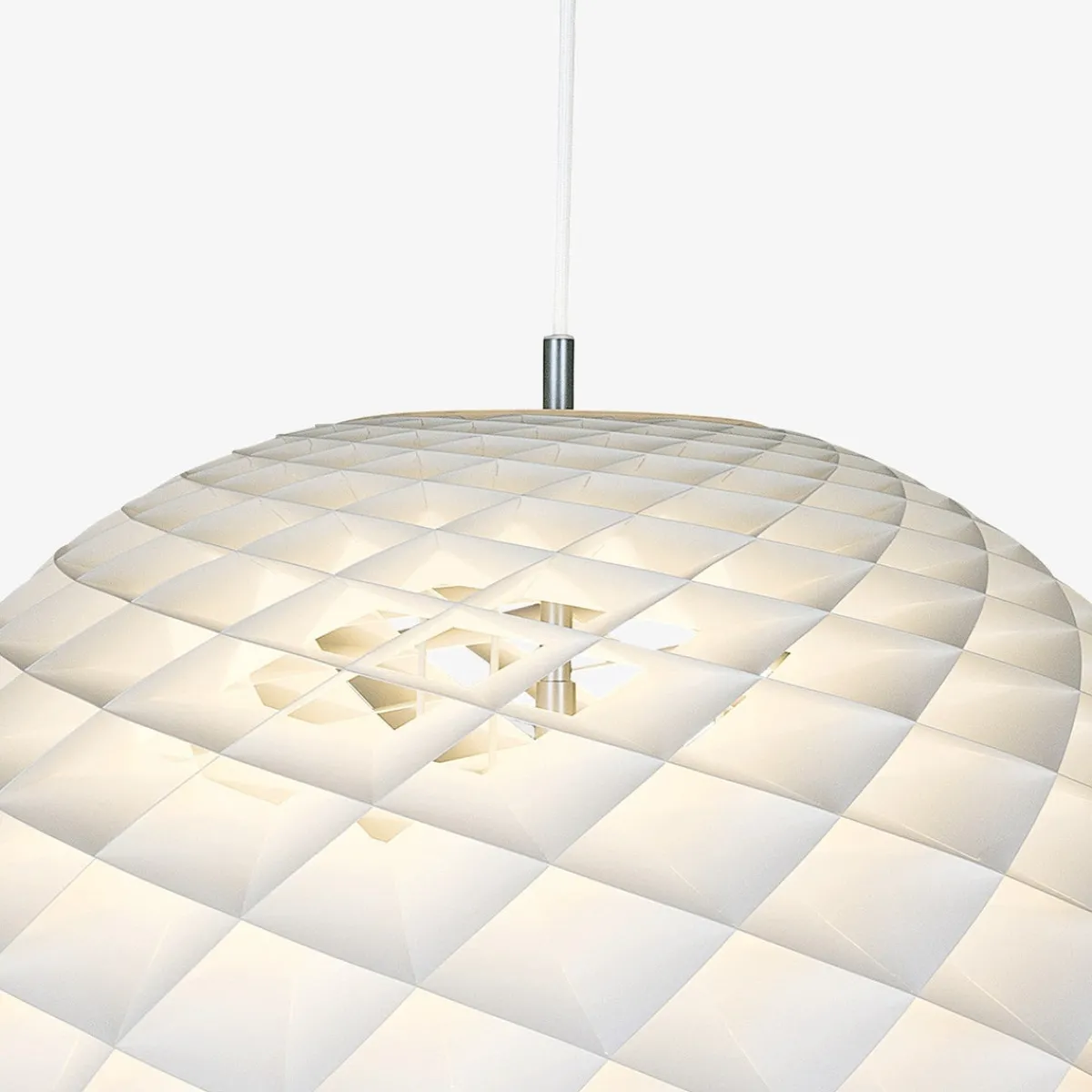 Den sfæriske pendelen avgir en blendefri lysglød som reflekteres av de små diamantformede cellene som armaturen er laget av. Strukturen på lampen sikrer at lyset er blendefritt fra over 45 graders vinkel, samtidig som armaturen avgir et nedadrettet lys og oppadrettet glød som lyset opp taket for å gi omgivelsene en god stemning. Hver celle former lyset ved å skape myke overganger mellom direkte og reflektert lys for å understreke pendelens strålende sfære.