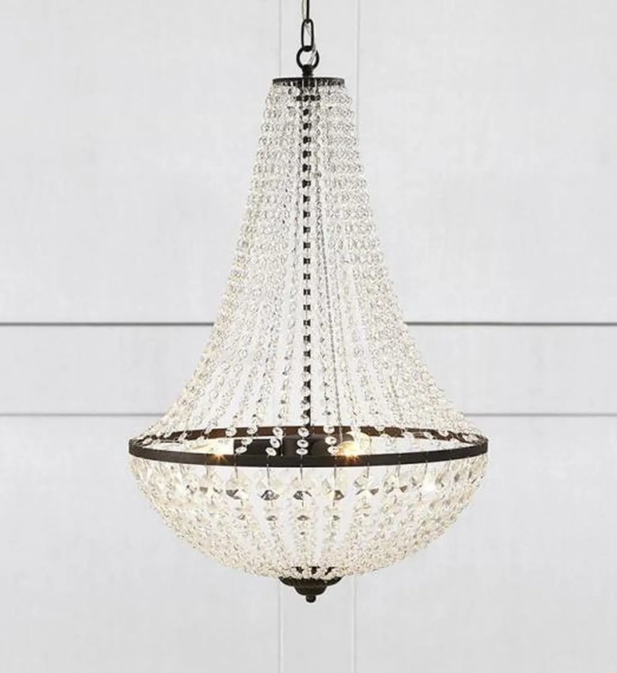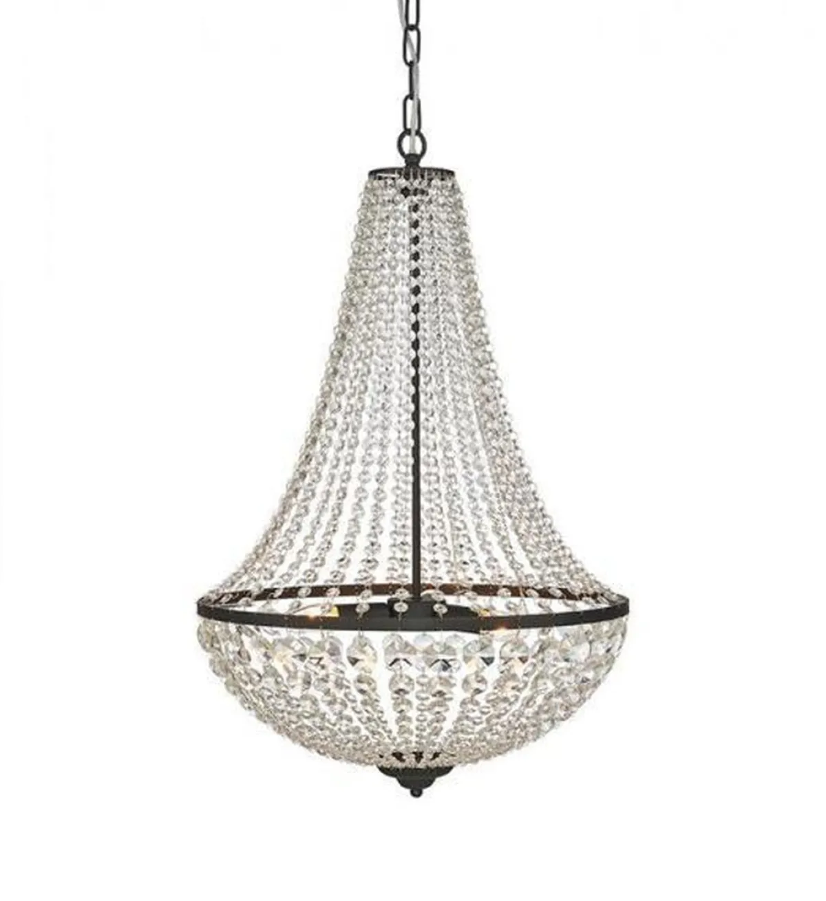 De svarte detaljene fremhever de klare prismene som skaper et lite spill i lysekronen.