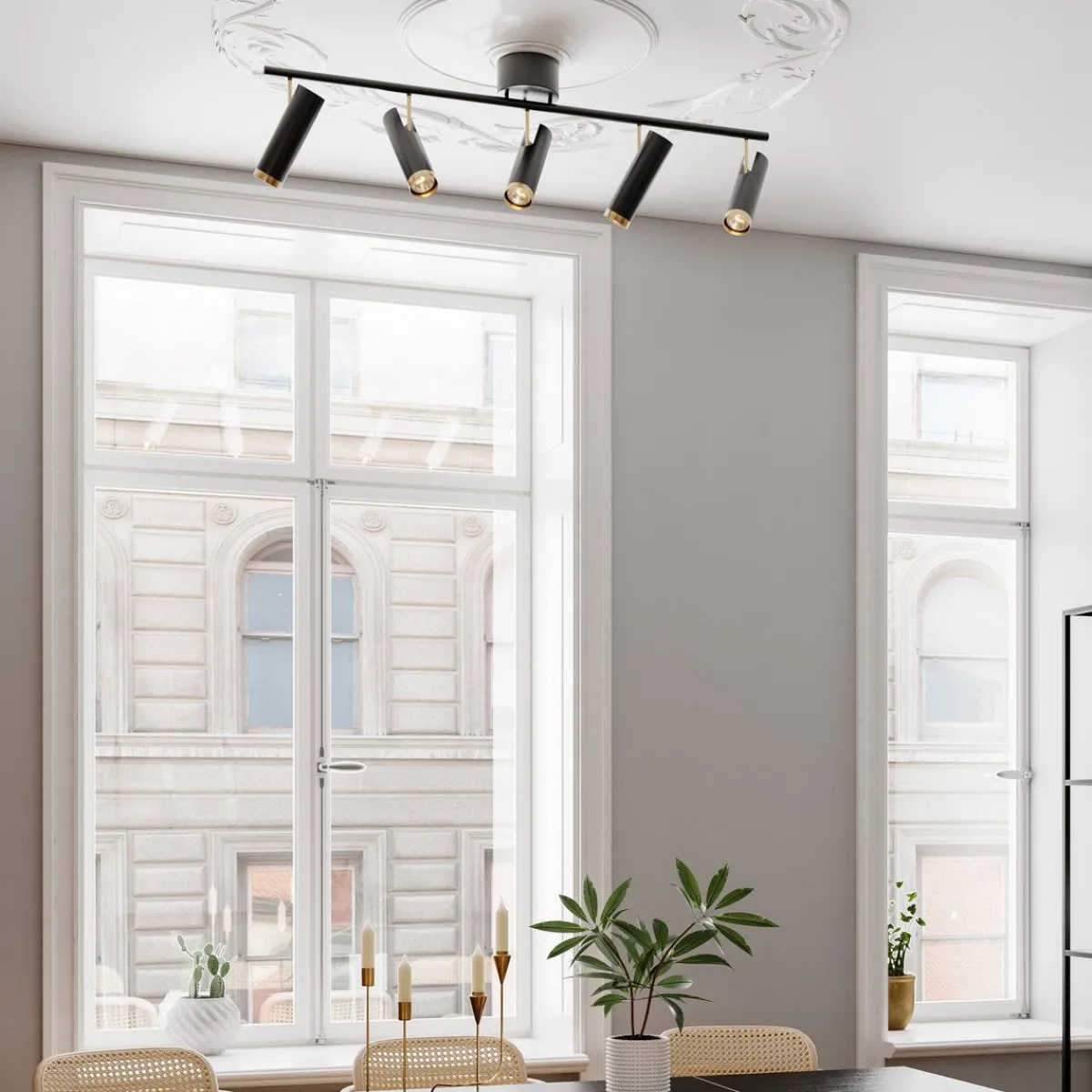 Fyll rommet med lys fra gulv til tak – Puls takskinne med fem spoter kan justeres i den retningen du ønsker. Skinnens design er enkel, men med en stor eleganse i moderne utførelse. Skinnen fås i matt hvit farge med fester av gullfarget metall som også går igjen på den ytterste delen av lampehodet. Festet er lett å montere opp i taket. La lampen sitte i taket i kjøkkenet, i entreen eller la den ta plass midt i stuetaket. Skinnen er 35 cm høy, 13 cm dyp og 110 cm bred.