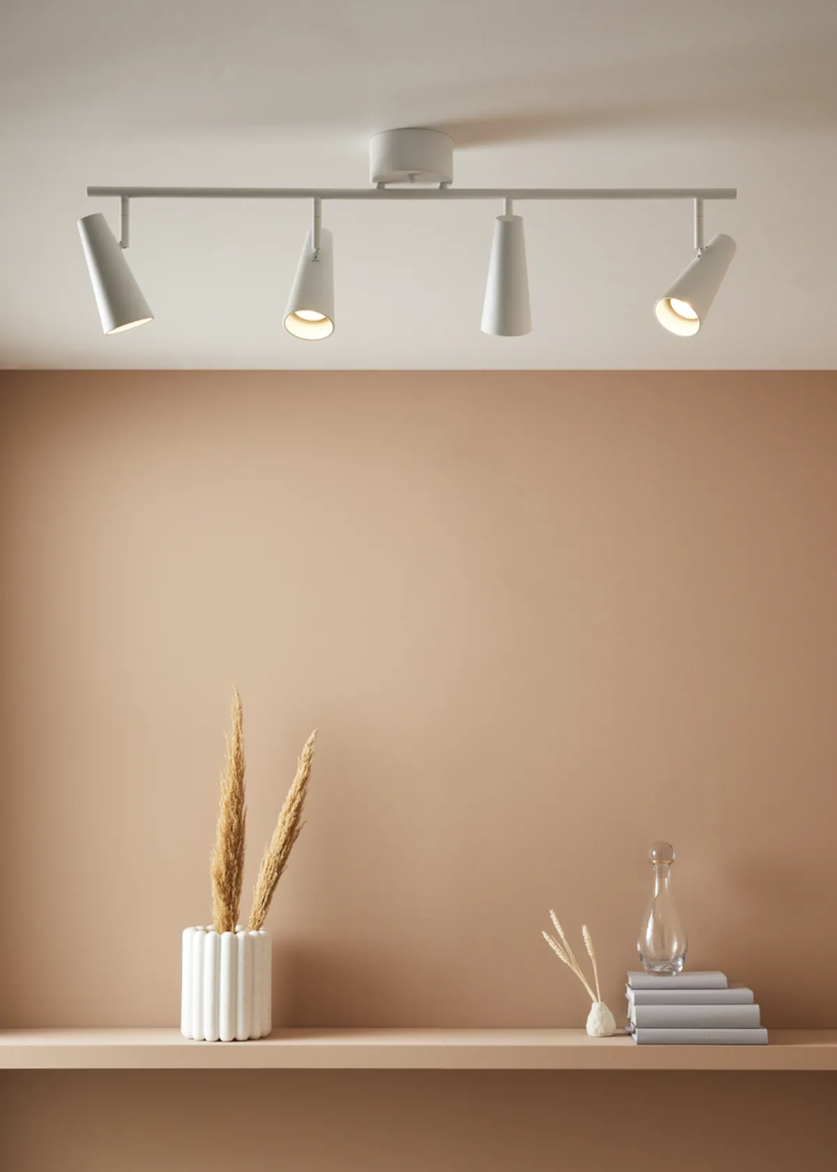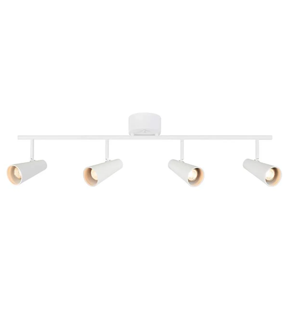 Enkel og moderne spotskinne med 4 spotter i hvit, som kan roteres. Lampen er dimbar ved bruk av dimbare lyspærer og ekstern dimmer.