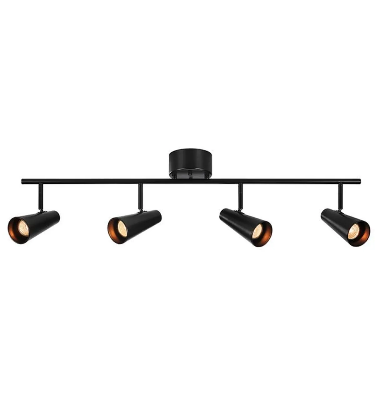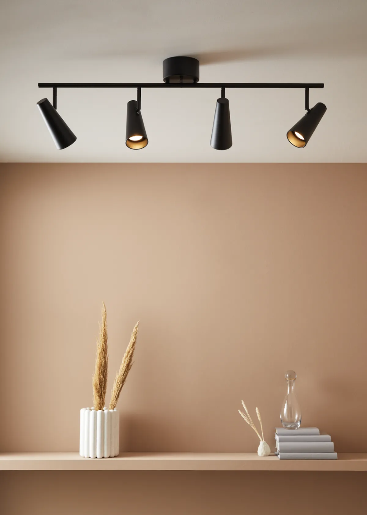 Enkel og moderne spotskinne med 4 spotter i sort, som kan roteres. Lampen er dimbar ved bruk av dimbare lyspærer og ekstern dimmer.