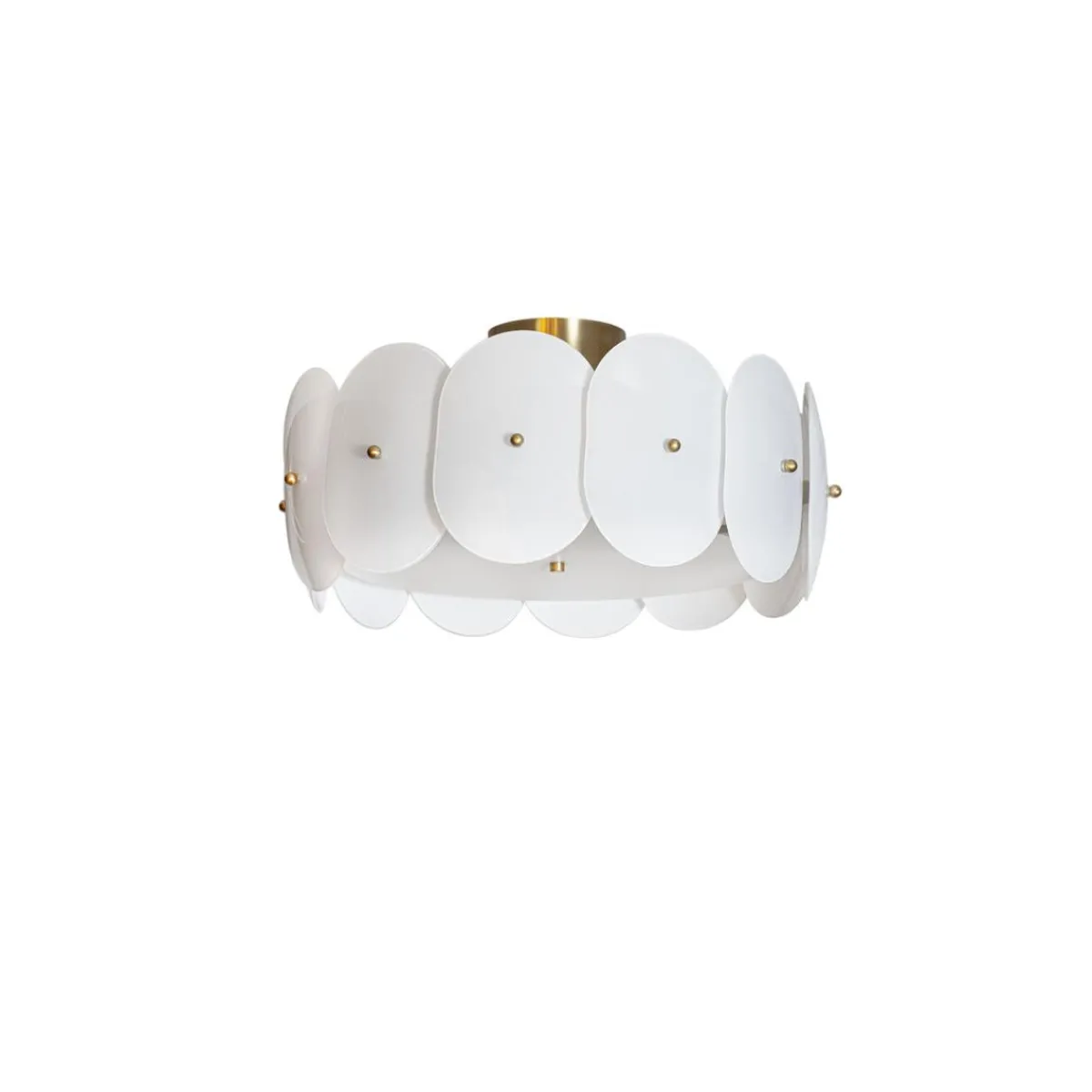 Omlott plafond, designet av den anerkjente Mia Lagerman, er en eksklusiv og dekorativ lampe som virkelig skiller seg ut med sin unike form og sitt uttrykk. Den runde, elegante designen i blankt hvitt glass skaper et mykt og behagelig lys, perfekt for å gi interiøret ditt det lille ekstra. De vakre messingknappene gir lampen en sofistikert og stilren følelse, noe som gjør Omlott til et iøynefallende element i hjemmet ditt.