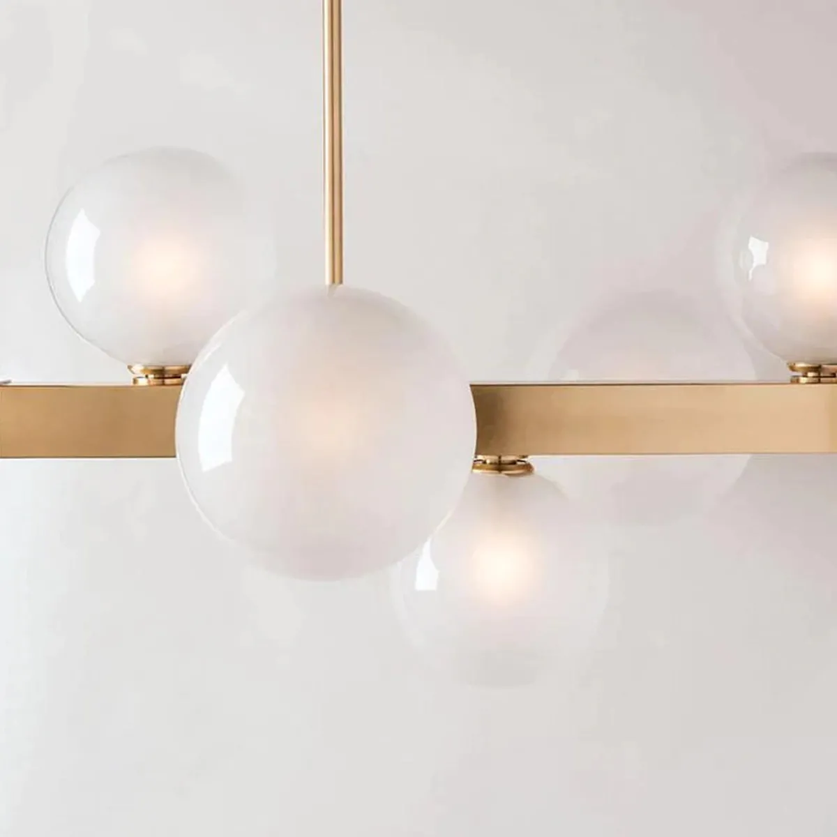 Lampen har 9 kupler i opalthvitt glass og gir godt med lys til rommet.