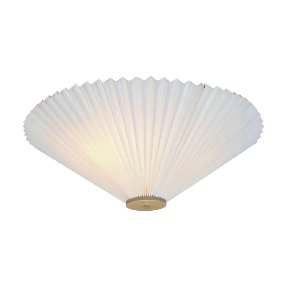 Plafond med lampeskjerm i hvitt papir. Lampen leveres med 3 stk E14 lampeholdere, klargjort for jordet tilkobling og krokoppheng til eksisterende takkontakt. Den øverste delen i beigefarget metall. Når lyset er på, spres det et fint lys i rommet. Perfekt å plassere i gangen, soverommet, stuen eller på kjøkkenet.