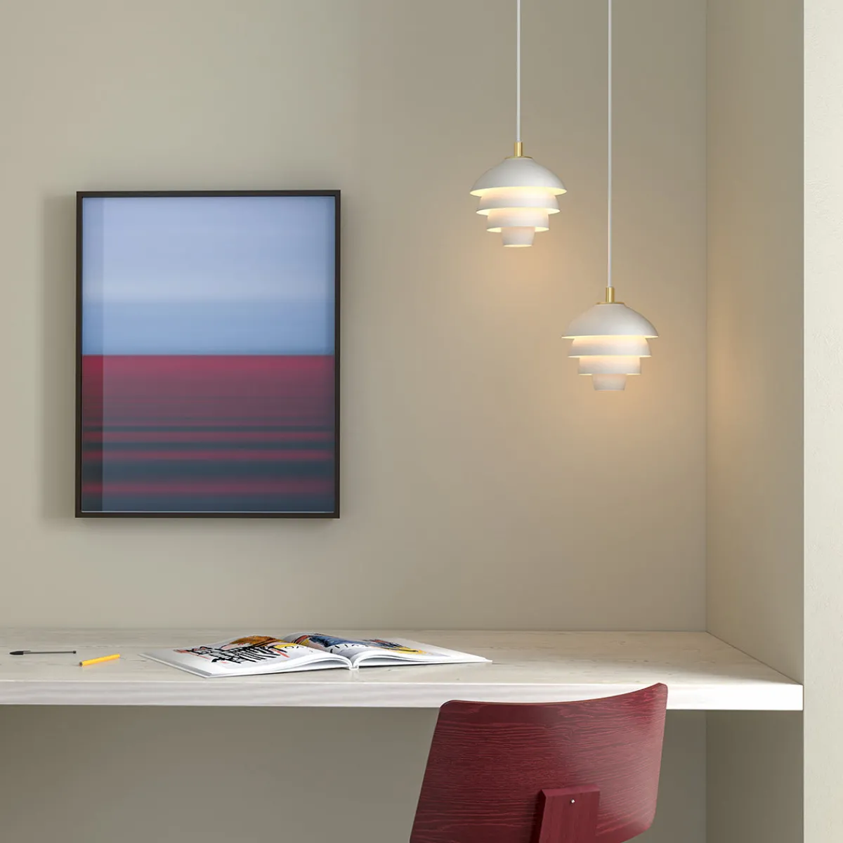 Håndlagde Valencia går inn i en ny æra med sin kombinasjon av matt hvit og massiv messing. Den nøye utvalgte matte hvite fargen sammen med håndpolerte varme messingdetaljer skaper et moderne, men tidløst uttrykk – perfekt tilpasset dagens interiør. Valencia finnes som pendel-, bord- og gulvlampe.