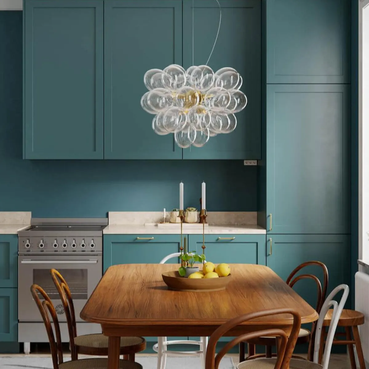 Lampen er 50 cm i diameter og kan heves og senkes. Ledningens samlede lengde er 120 cm. Lyskilder med G9-sokkel kjøpes separat. Hvis et glass skulle gå i stykker, går det an å kjøpe reserveglass senere.