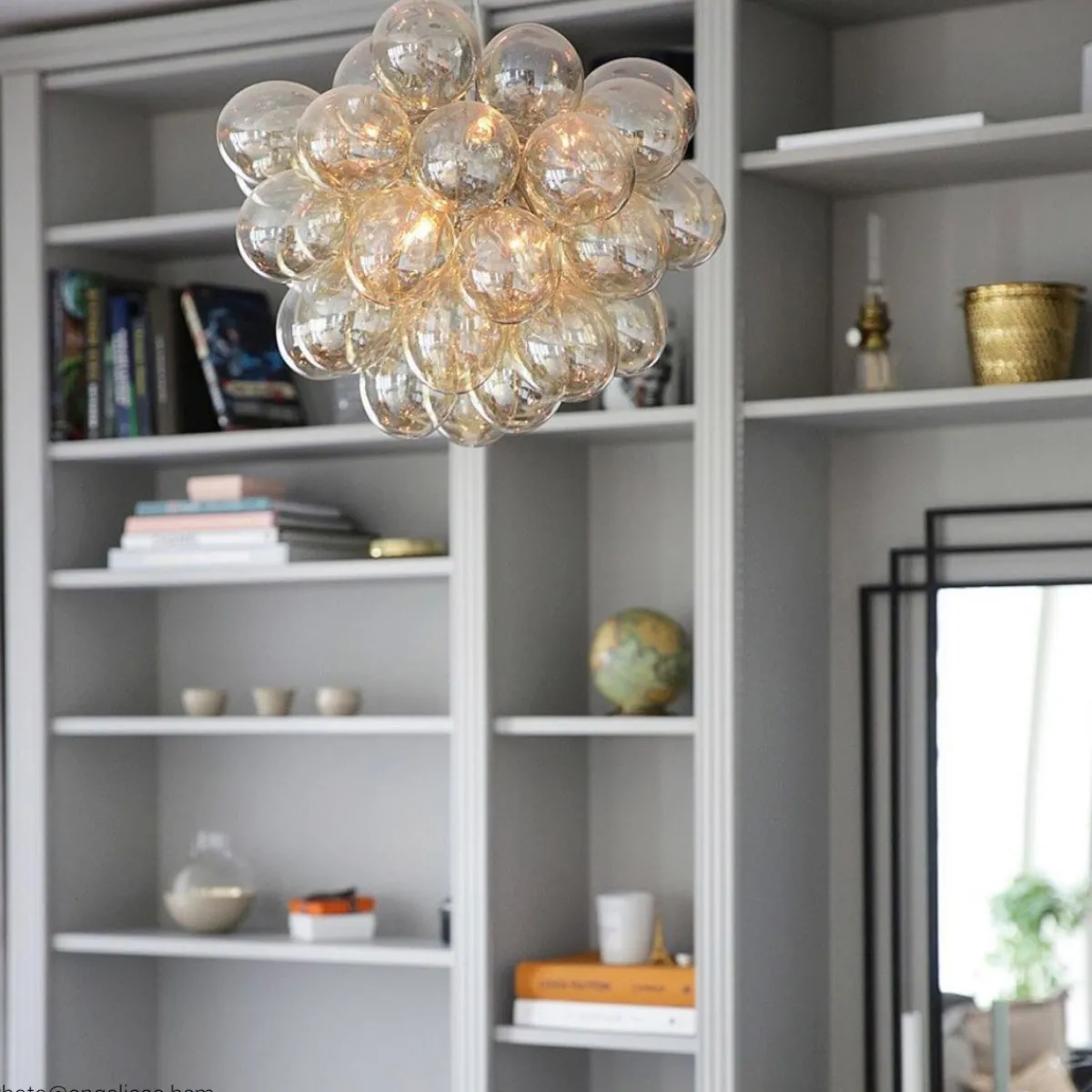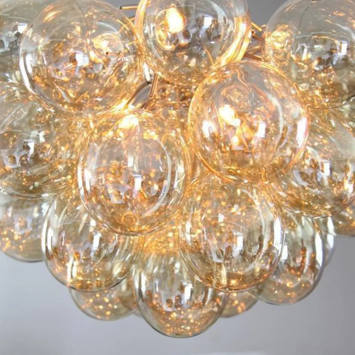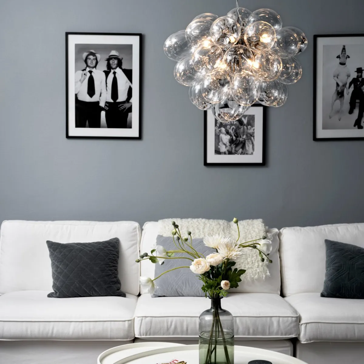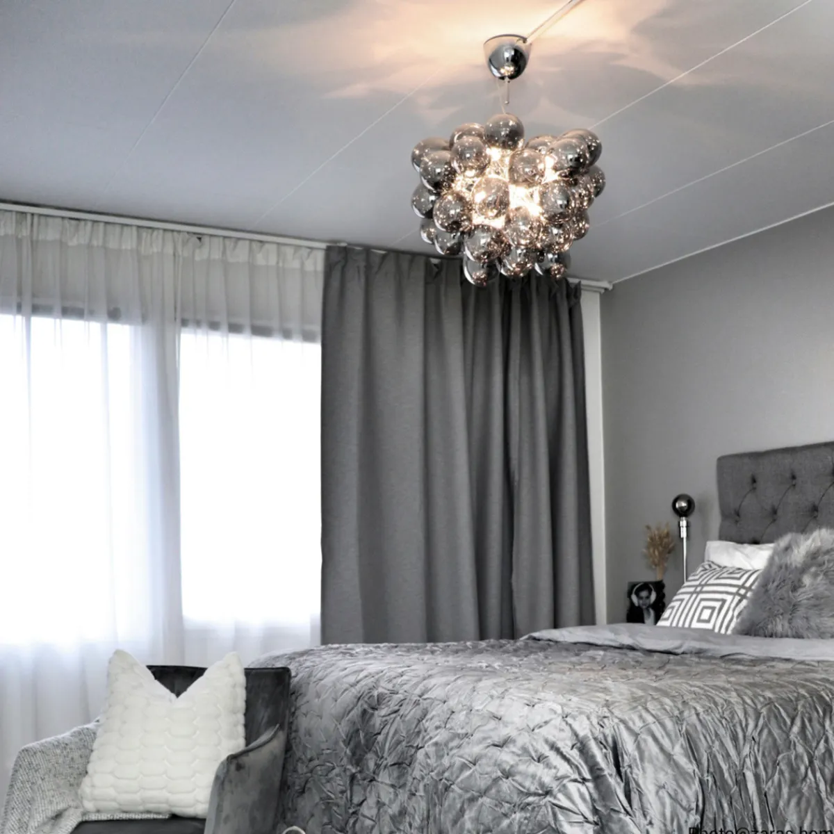 Unn deg høyden av luksus og stil med Gross taklampe Ø50cm, en svevende sky av 37 lette, munnblåste glassklokker som ligner atomer og avgir et herlig skinn. Gross er By Rydéns egen serie og et blikkfang i nettbutikken vår. Lampen finnes flere farger; Matt hvitt, Ravgult, Røykgrått, Flerfarget och Nacreous.