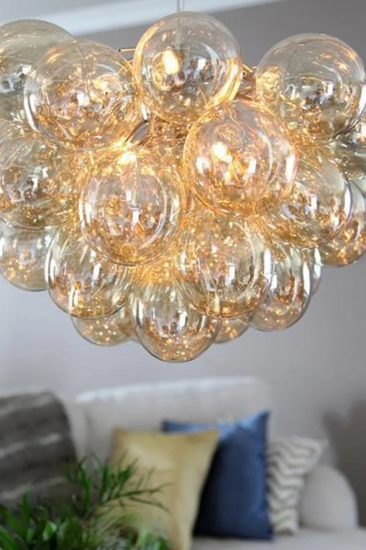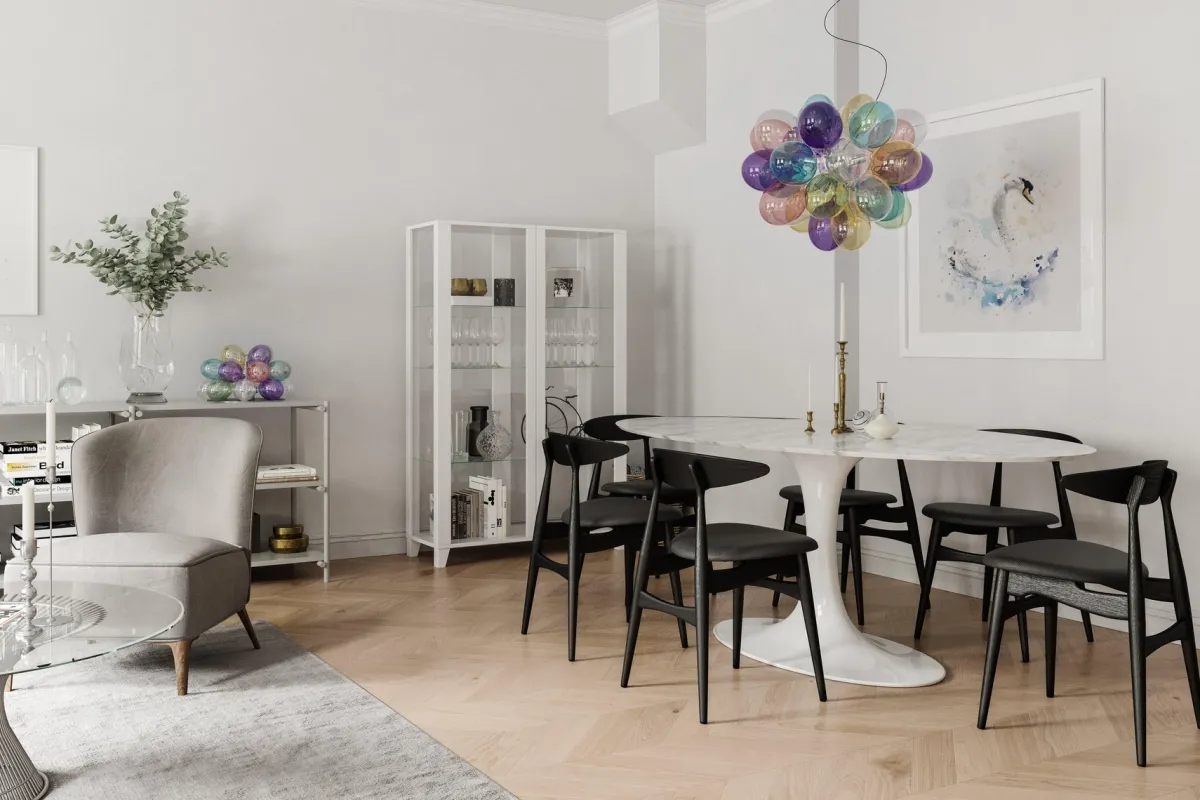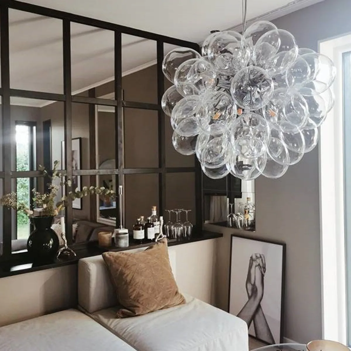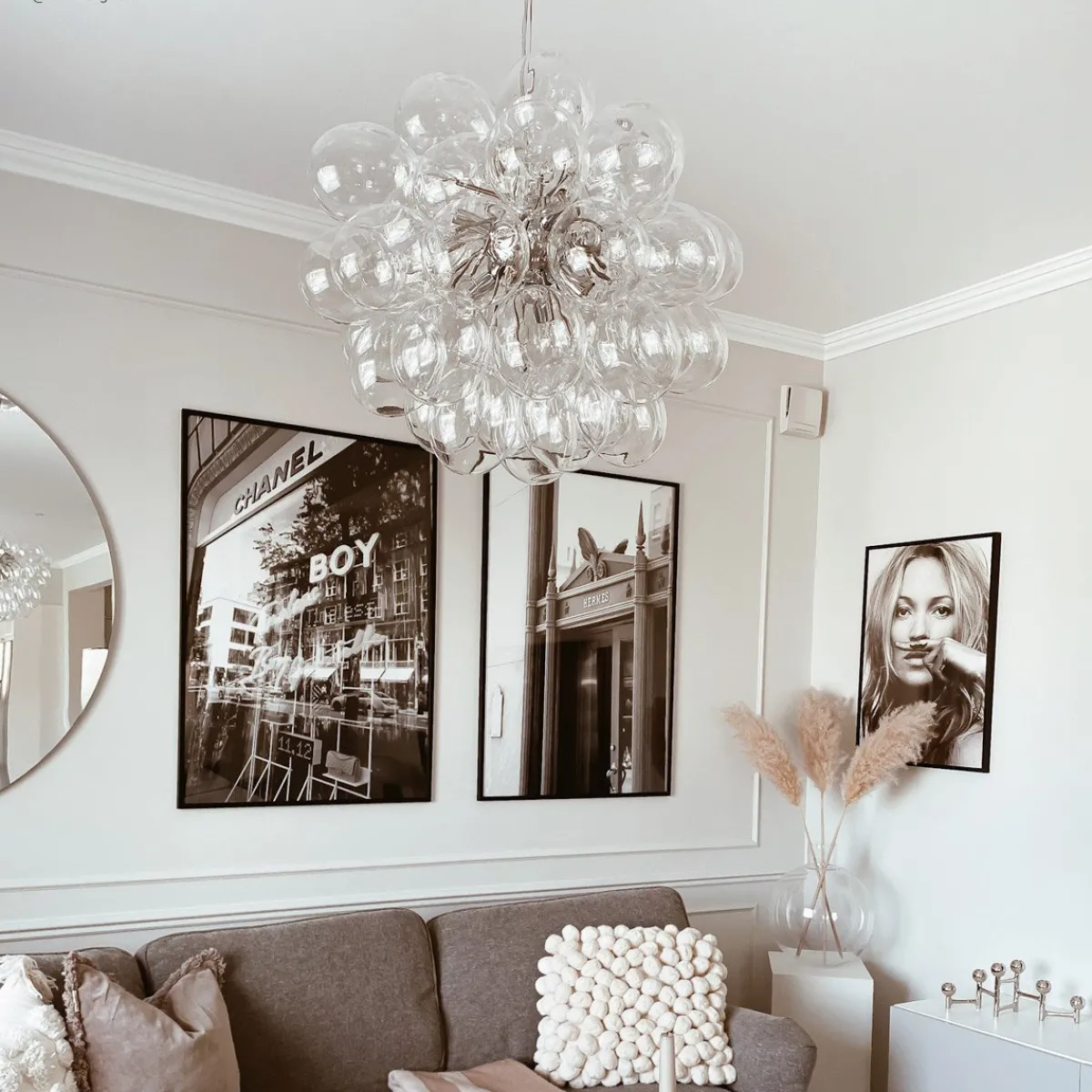 Unn deg høyden av luksus og stil med Gross taklampe Ø50cm, en svevende sky av 37 lette, munnblåste glassklokker som ligner atomer og avgir et herlig skinn. Gross er By Rydéns egen serie og et blikkfang i nettbutikken vår. Lampen finnes flere farger; Matt hvitt, Ravgult, Røykgrått, Flerfarget och Nacreous.