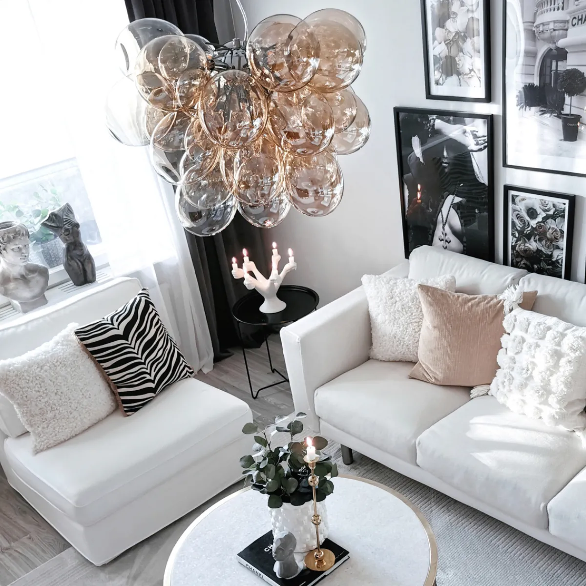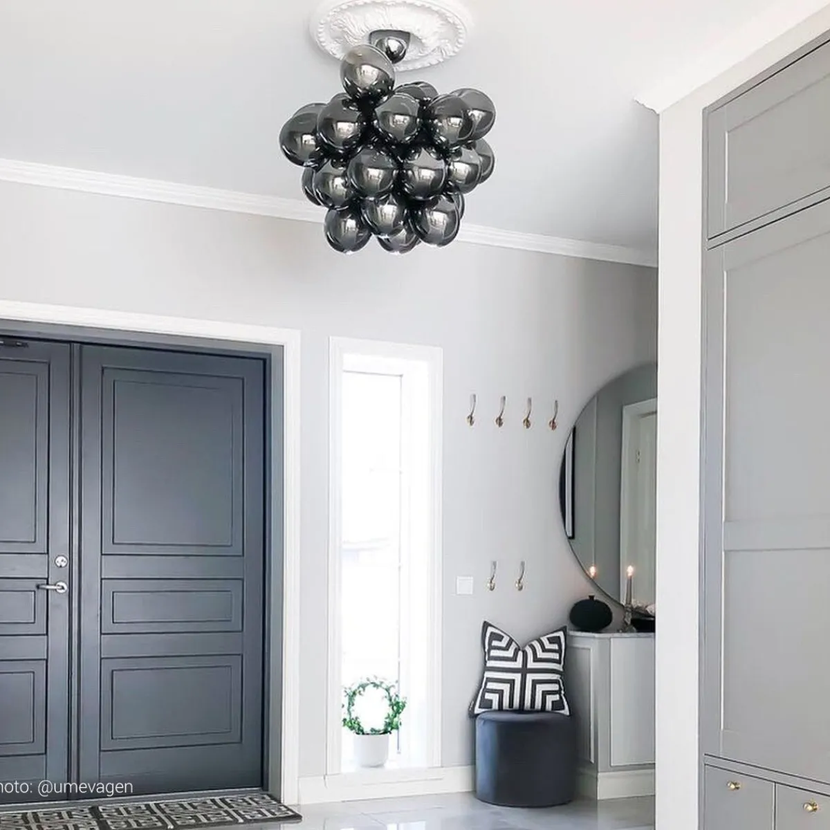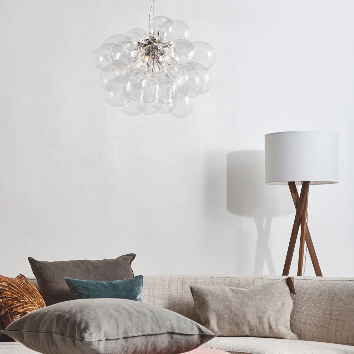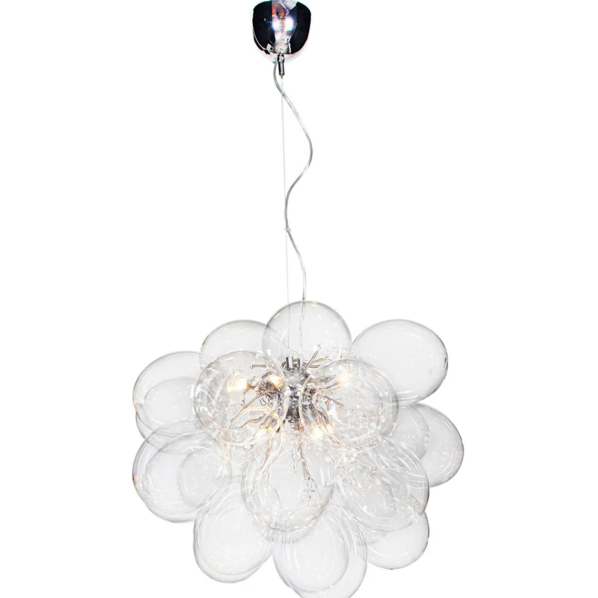 Vår populære taklampe Gross har fått en større slektning! Gross Grande har en diameter på ca. 62 centimeter og er en fantastisk, eksklusiv taklampe i glass bestående av sarte, munnblåste glasskuler som danner en lampe som ligner en sky. Glasskulene teller 32 stykker og består av både 24 større og 8 mindre kuler. Gross Grande krever 8 lyskilder med sokkel G9. Taklampen er hev- og senkbar og finnes i fargene ravgult, røykgrått og klart glass. Denne taklampen skaper virkelig et utropstegn i hjemmet ditt og fungerer like godt på et soverom som over kjøkkenbordet eller i en romslig entré.
