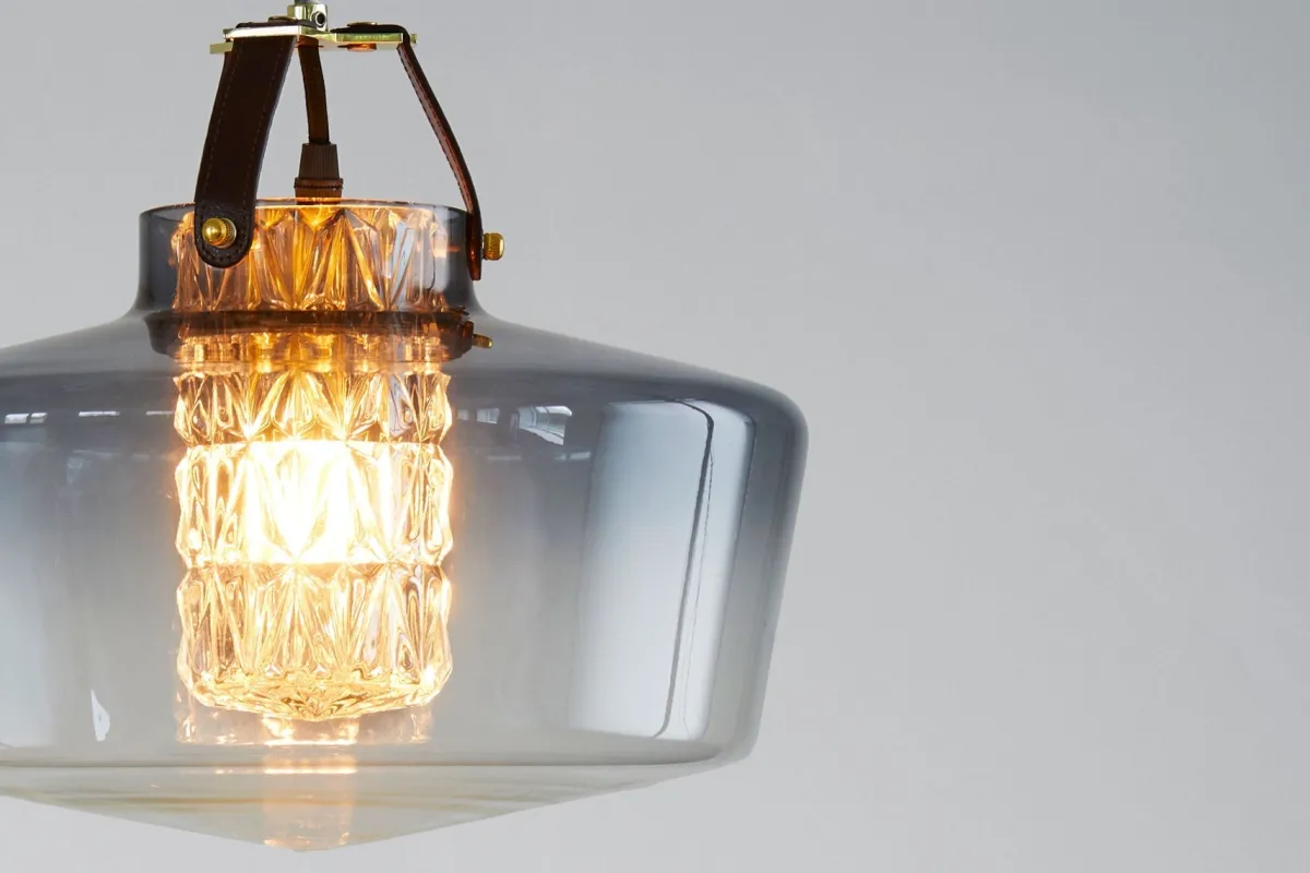 Addicted to us er en estetisk og rå lampe. Lampen har ytterskjerm i håndblåst røykfarget glass og en indre kjerne i klart, fasettslipt glass. Lampens oppheng er i sort med tre sorte remmer i lær.