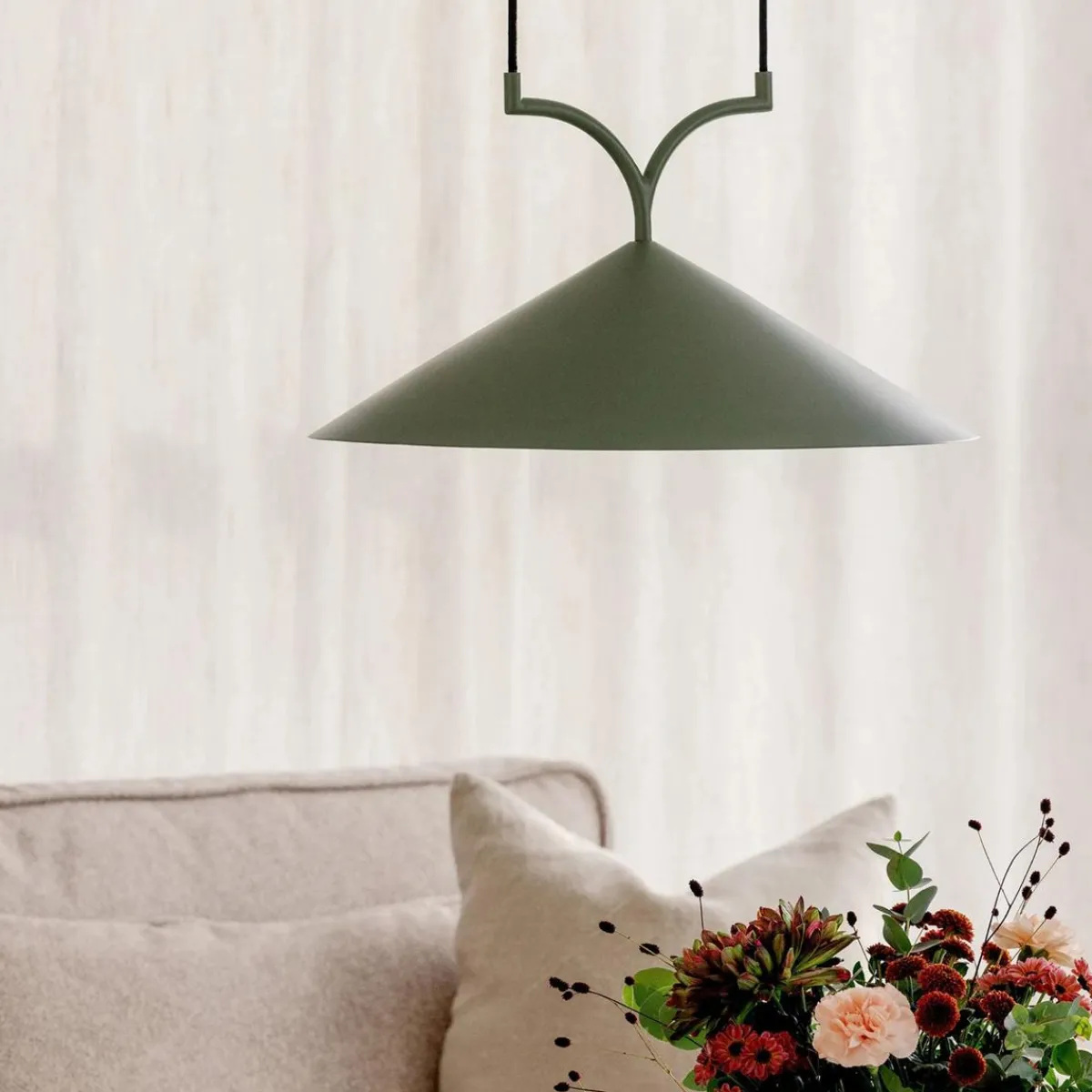 Curve er laget av mattlakkert metall og har to 120 cm lange svarte tekstilledninger med en matchende metalltakopp.