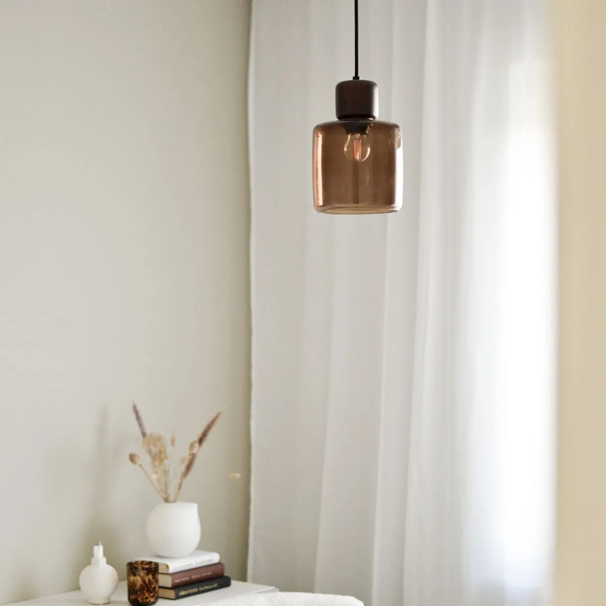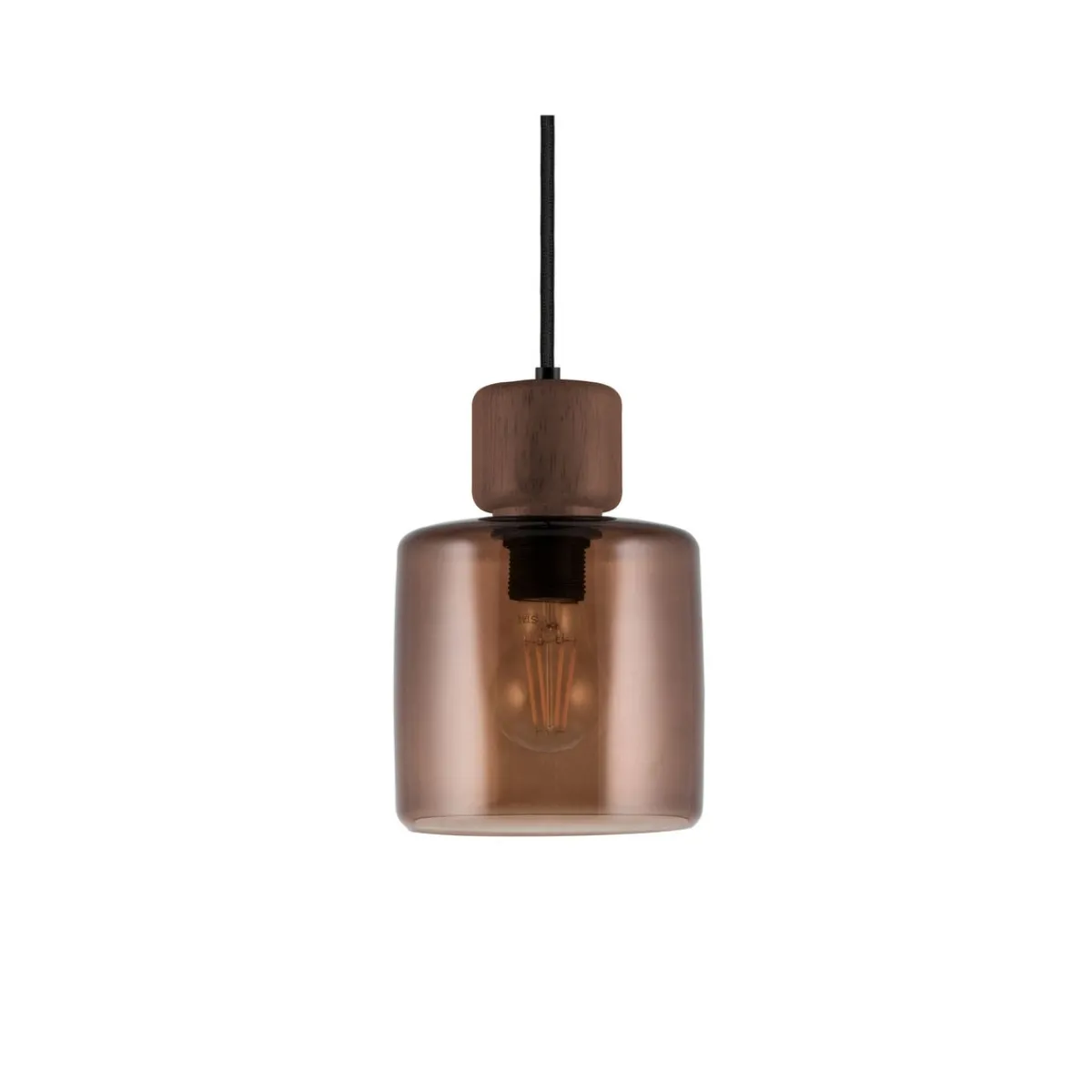 Lampen har en kopp som er laget av brunfarget glass med knott på toppen i valnøttfarget tre. DOT har en 120 cm lang sort tekstilledning og takkopp i sort plast.