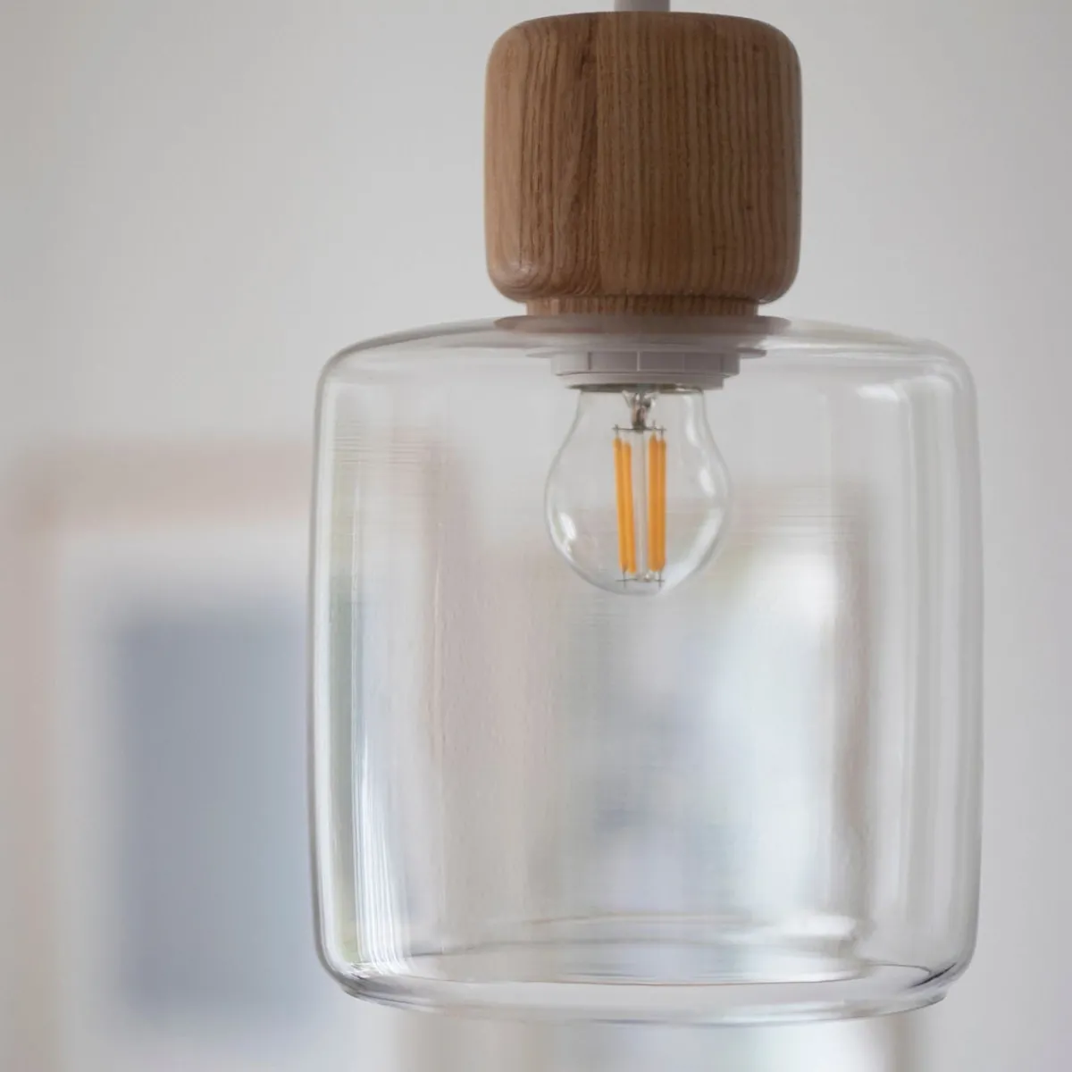 Lampen har en kopp av klart glass med knott på toppen i lyst tre. DOT har en 120 cm lang hvit tekstilkabel og takkopp i hvit plast.