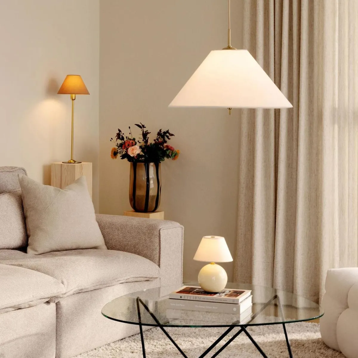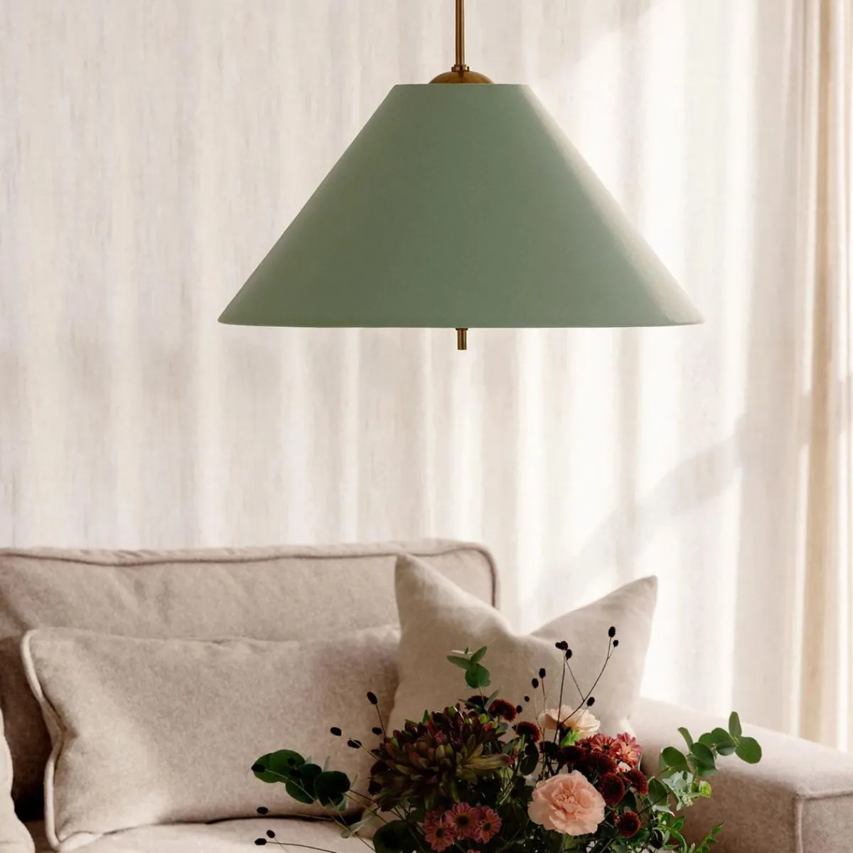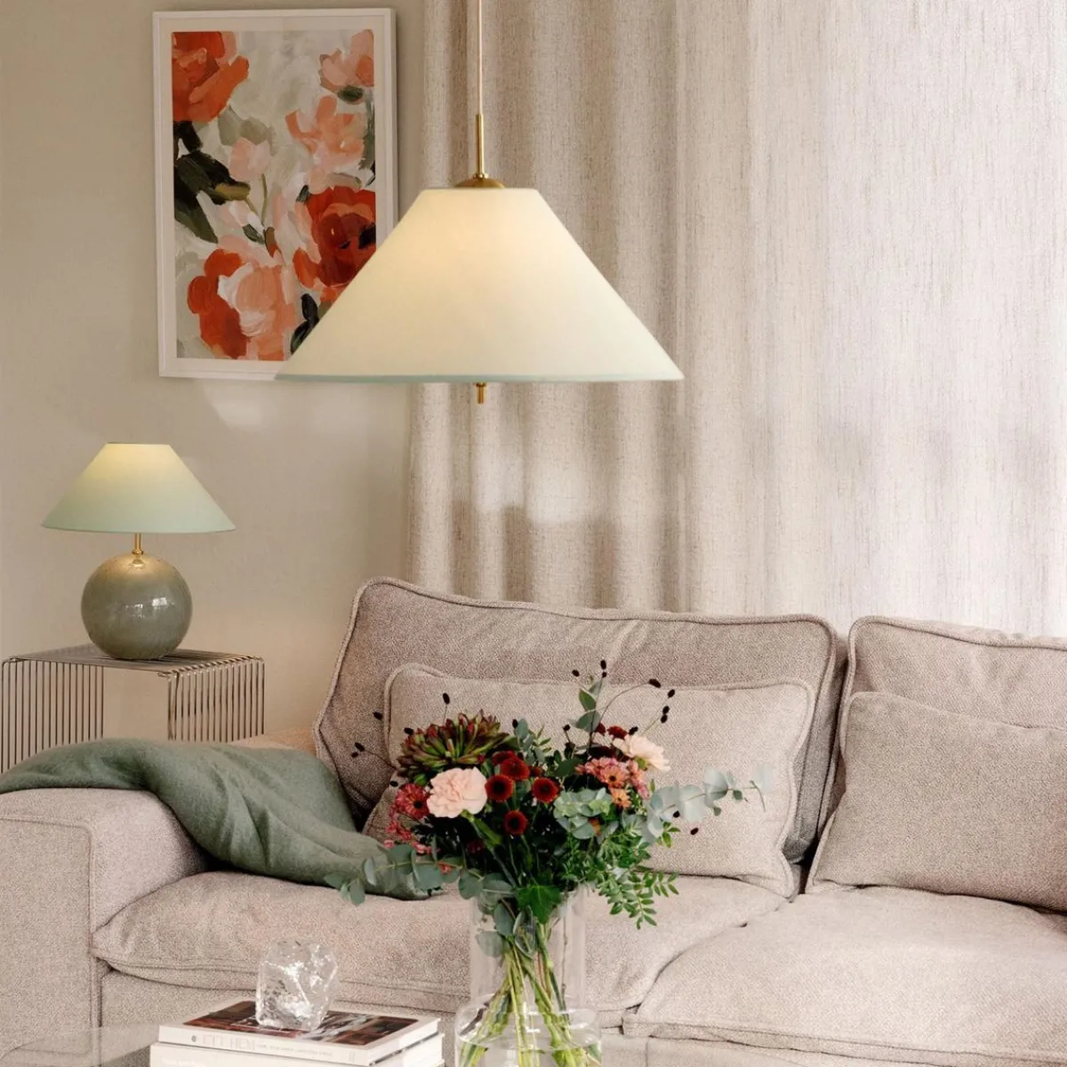 Iris-pendelen blir en vakker juvel i taket. Den nydelige tekstilskjermen er håndlaget av bomull og komplettert med messingsdetaljer.