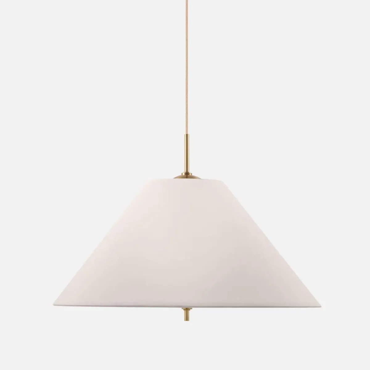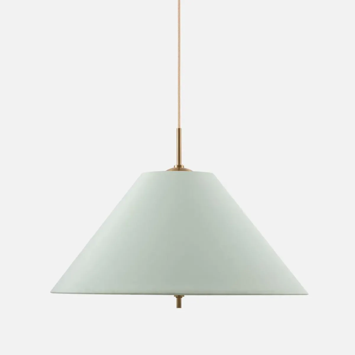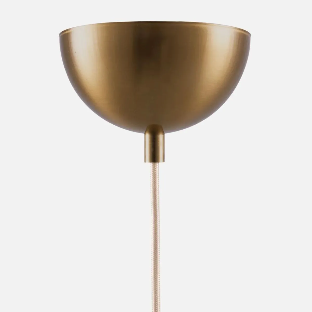 Lampen har en 120 cm lang beige tekstilledning med en messing takkopp.